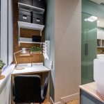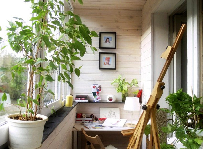 - Penyingkiran ke kawasan balkoni bengkel, di mana anda boleh meletakkan semua barang yang diperlukan untuk bekerja dengan bantuan sebilangan besar perabot dan rak gantung.