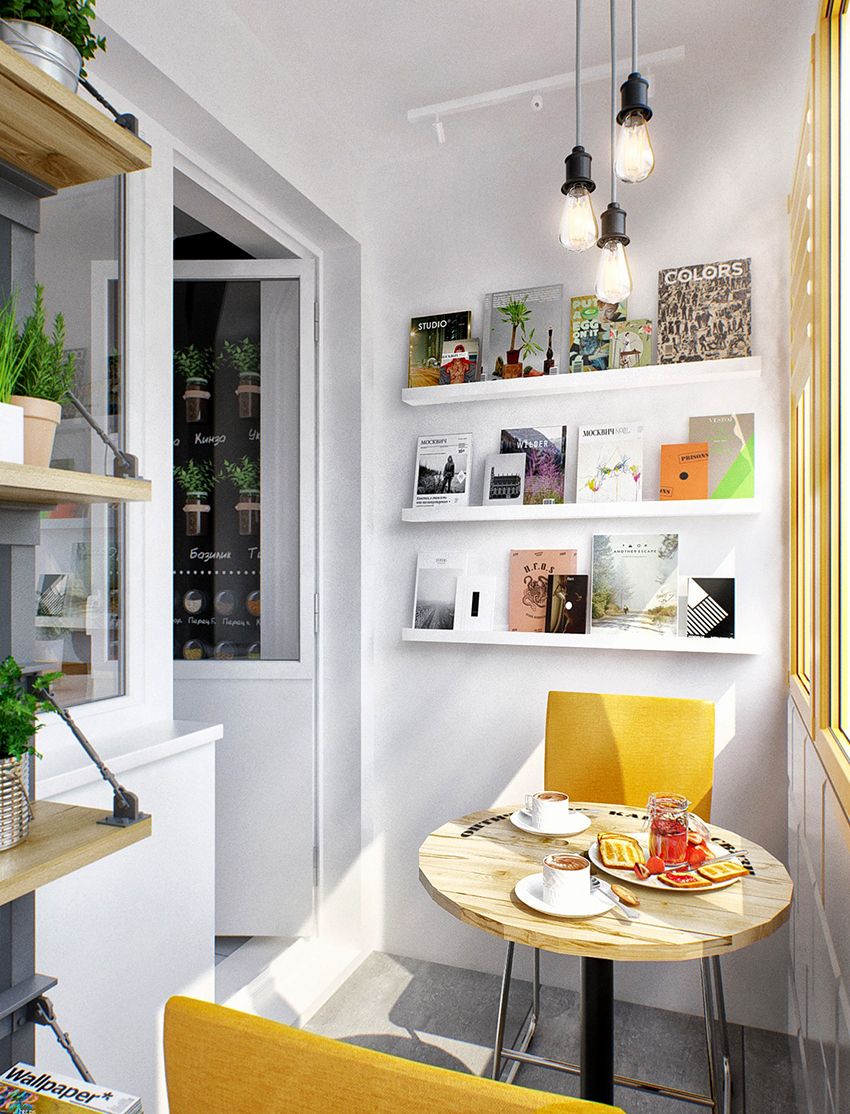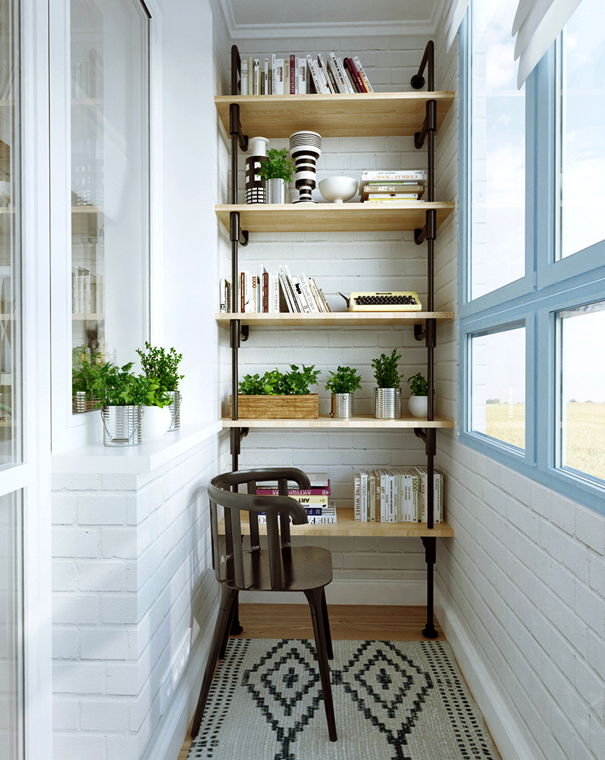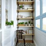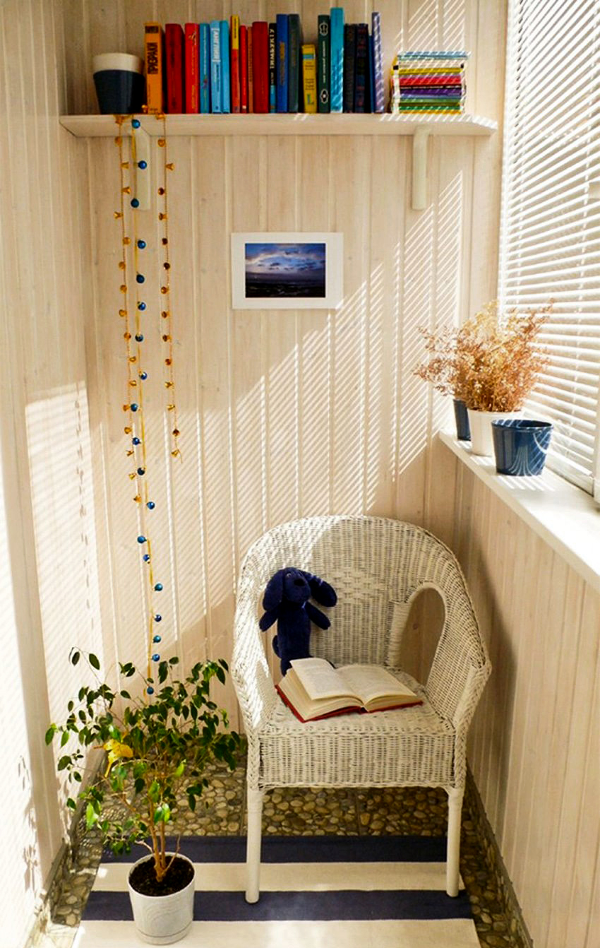 Sekiranya balkoni kecil, rak dengan buku boleh diletakkan di sudut dan dinding panjang. Sebaiknya pasang meja dan kerusi yang selesa berhampiran mereka. Oleh itu, ruang dengan mudah berubah menjadi perpustakaan yang selesa, yang sesuai untuk dilengkapi dengan lampu lantai yang baik dengan teduhan berputar. Sofa kecil dengan bantal lembut atau kerusi goyang akan menjadi tambahan yang ideal untuk bilik.