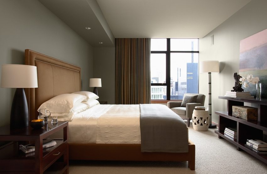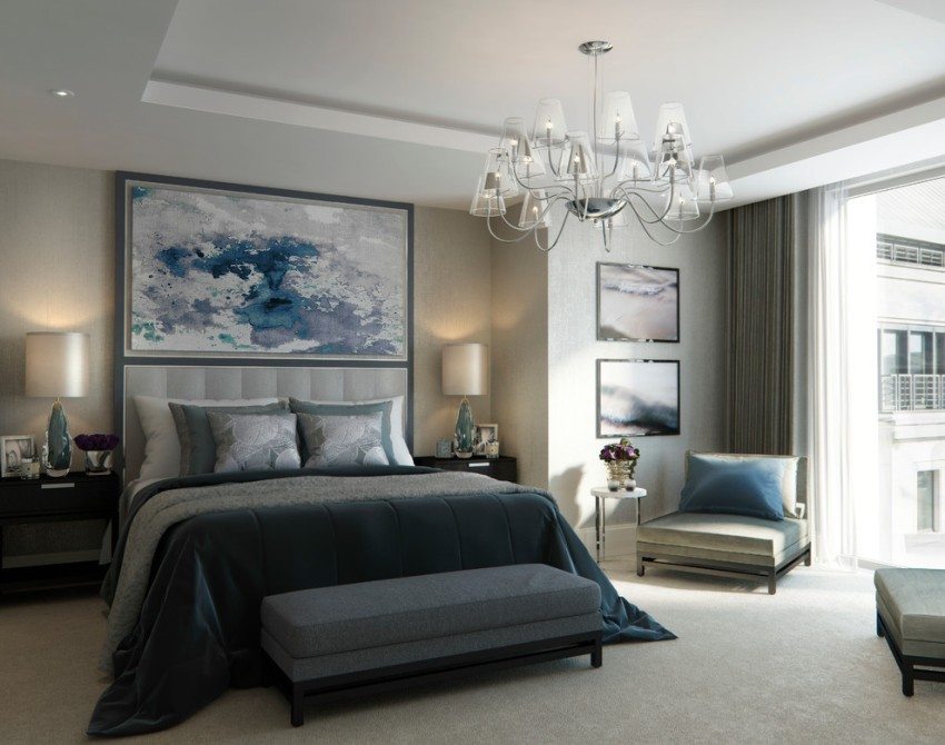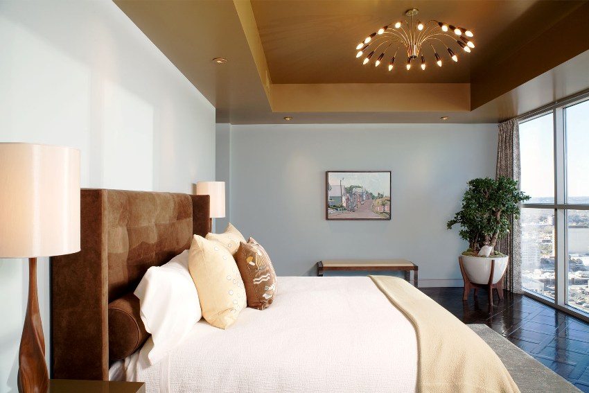 Pencahayaan di bilik tidur haruslah istimewa. Ia perlu dimalapkan. Untuk melakukan ini, anda boleh menggunakan lampu gantung utama atau lampu dan bebas sumber cahaya titik... Candelier dipasang ke siling dengan cara biasa, tetapi untuk memasang lampu sorot terpasang, anda perlu menggerudi jumlah lubang yang diperlukan dengan alat pemotong, di mana anda boleh menarik wayar. Setelah selesai selesai, anda perlu memasukkan lampu itu sendiri ke dalam lubang ini.