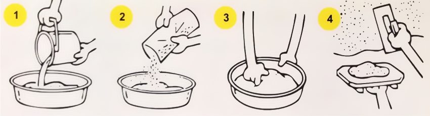 Hanya satu beg yang harus diuli dalam satu bekas pada satu masa. Sebahagian daripada bungkusan tidak boleh direndam. Adalah perlu untuk segera menyediakan sejumlah mortar yang akan menutup dinding dari sudut ke sudut sehingga tidak ada perbezaan yang dapat dilihat semasa peralihan.Penyelesaian yang dihasilkan harus disuntik selama beberapa jam. Kacau sebati sebelum digunakan.