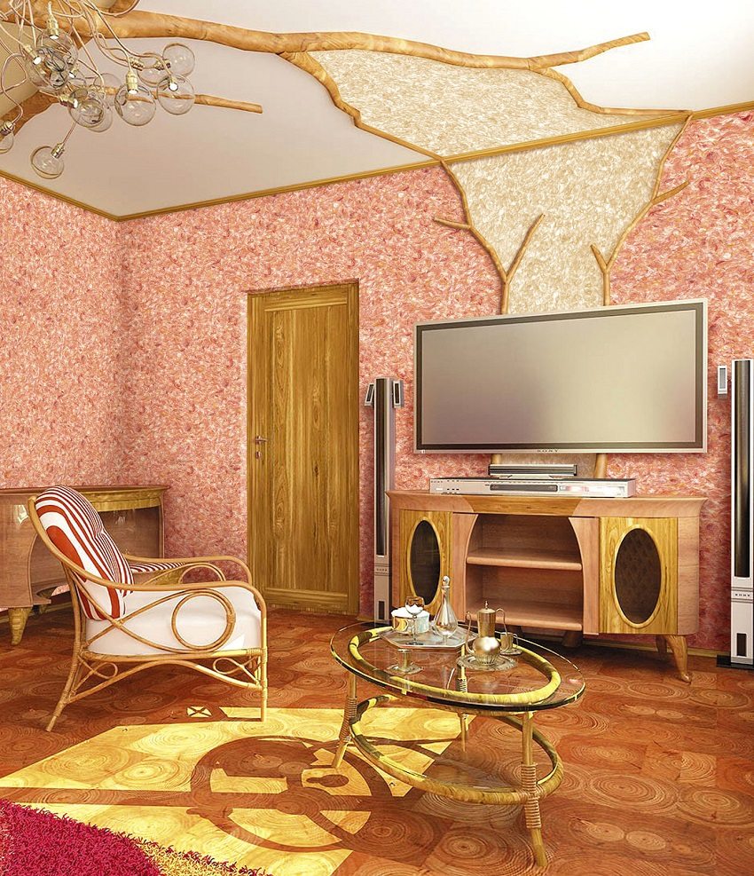 - daya tarikan estetik. Bahan penamat ini, kerana strukturnya, membolehkan anda membuat pelbagai variasi penyelesaian hiasan. Malah pereka profesional senang menggunakan kertas dinding cecair. Foto-foto dalaman di mana lapisan ini berjaya digunakan boleh didapati di Internet;
