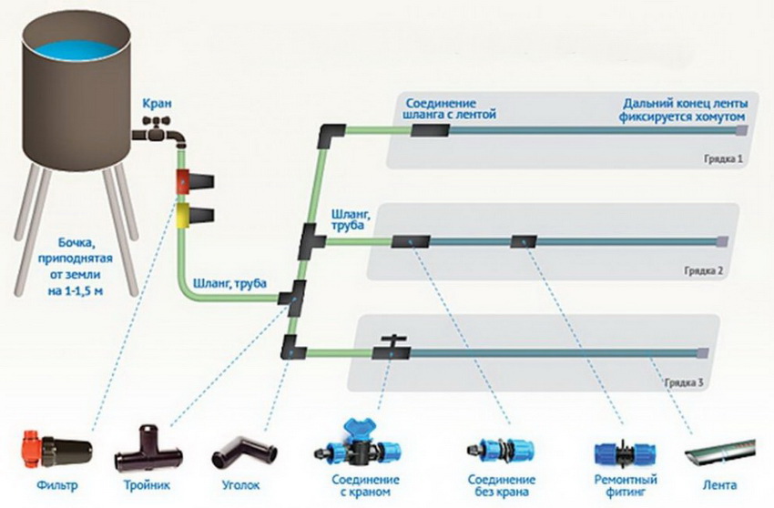Untuk mengedarkan air, paip utama disambungkan ke tangki, dari mana cawangan mengikuti ke titik pengairan