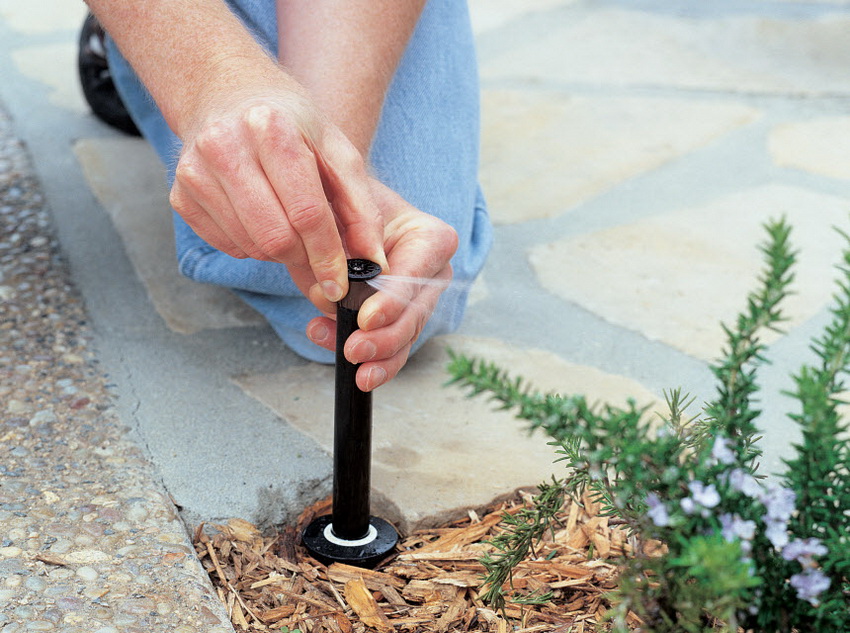 Untuk penganjuran autowatering untuk bunga dan rumput, skim pengairan penyiram boleh diterima. Ini juga dapat digunakan di negara ini, menyiram penanaman yang tumbuh rendah, tingginya 10-15 cm. Dalam hal ini, saluran paip diletakkan di bawah tanah agar tidak menimbulkan halangan ketika memotong rumput. Penyiram juga boleh terletak di tanah dan memanjang pada permulaan sistem. Autowatering boleh berfungsi tanpa unit pam. Air dibekalkan secara graviti, yang paling sering digunakan untuk pengairan titisan.