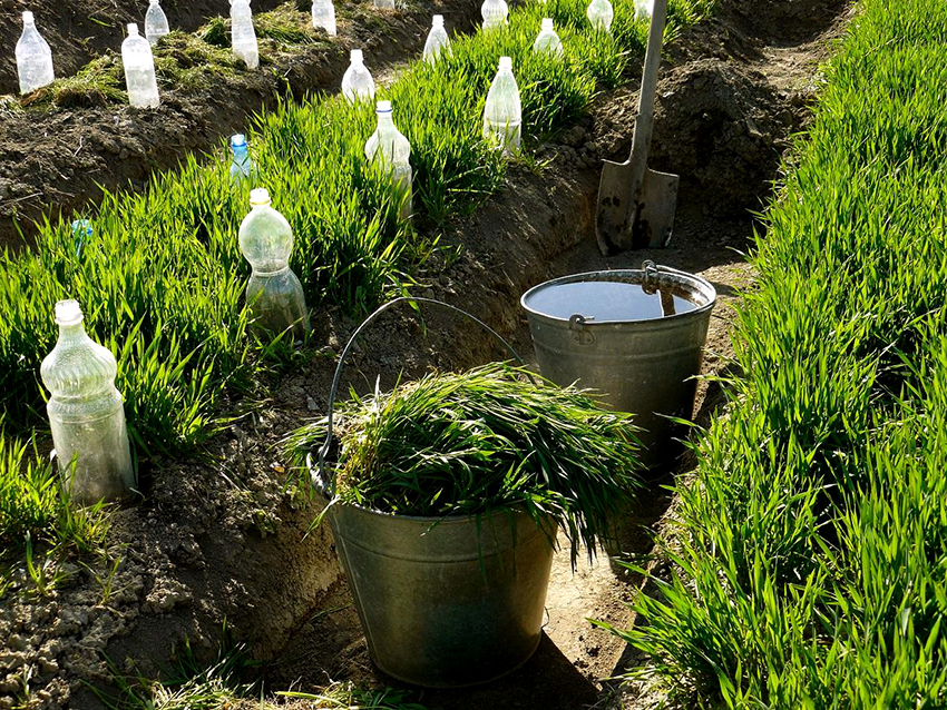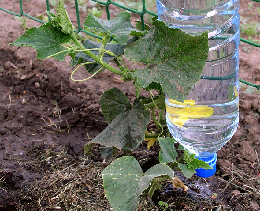 Pilihan yang paling popular untuk pengairan dari botol plastik adalah menjatuhkan bekas di antara tanaman.