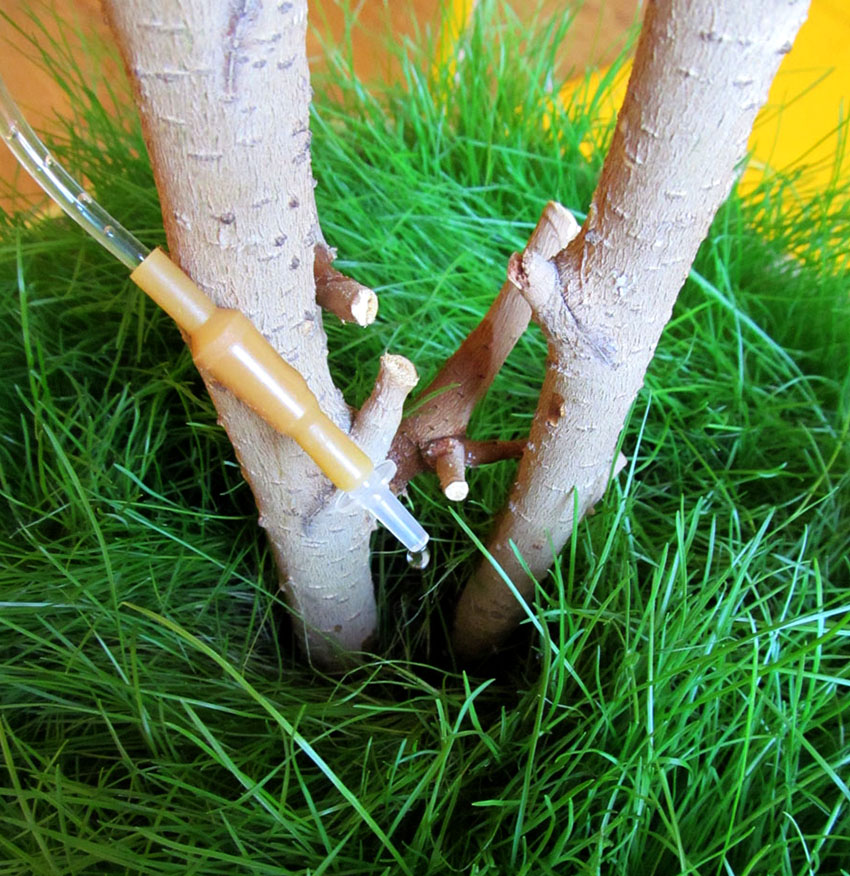 Perlu membuat lubang pada batang, bilangan dan ukurannya bergantung pada intensiti kelembapan yang diperlukan. Ia diarahkan ke akar tanaman, bergantung pada botol mana yang digali ke tanah hingga kedalaman yang diinginkan. Bekas diisi dengan air dan ditutup dengan penutup.