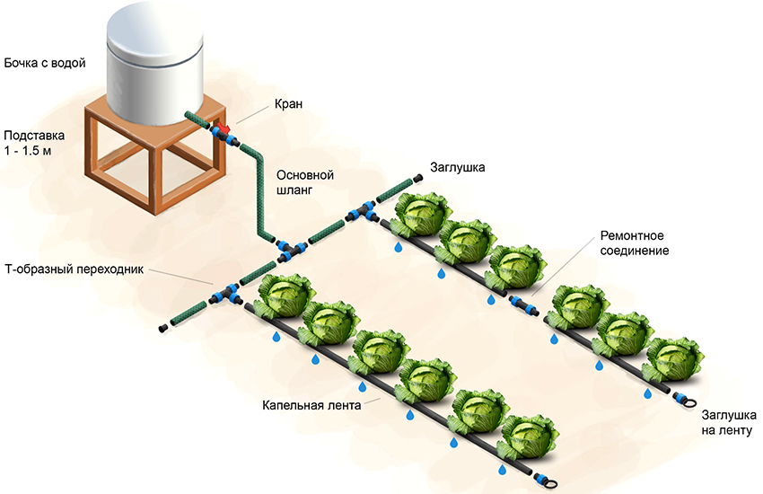 Pemasangan sistem ini didahului dengan penciptaan susun atur semua elemen penyusunnya, dan ini, seterusnya, bergantung pada susun atur laman web dan lokasi tempat tidur. Gambar rajah harus menunjukkan sumber bekalan air, paip utama dan selang saluran keluar sehingga anda dapat mengira jumlah bahan yang diperlukan. Lebih baik menggunakan tong plastik sebagai sumber bekalan air untuk pengairan titisan. Bahan ini tidak menghakis, yang bukan sahaja akan meningkatkan jangka hayat produk, tetapi juga menghilangkan kemungkinan tersumbat sistem dengan zarah karat.