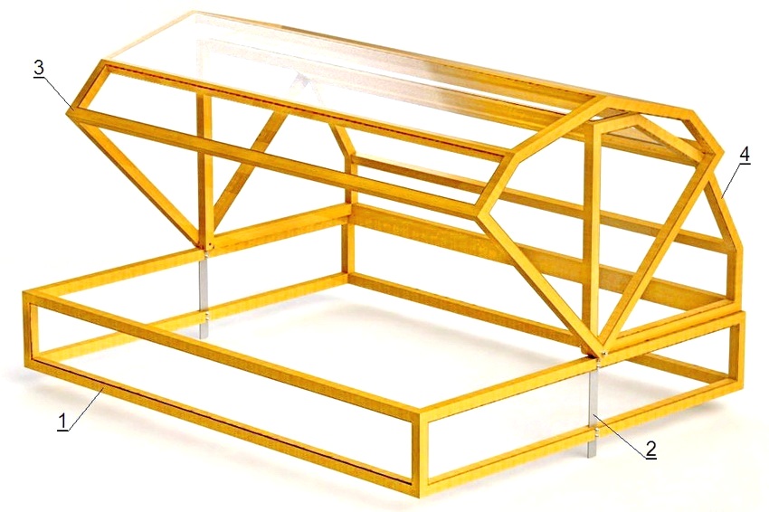 Rangka bawah dipasang dari dua paip masing-masing 3,96 m dan bahagian dua meter, yang dikimpal bersama di sudut. Jahitan mesti dibersihkan. Dengan menggunakan mesin kimpalan, dinding sisi dikimpal ke bingkai bawah yang telah siap. Kemudian anda perlu memperbaiki tiang akhir di tengah-tengah elemen sisi dan bawah. Sebagai panduan, anda boleh menggunakan gambar kotak Roti rumah hijau, yang memaparkan model dengan ukuran yang sesuai.