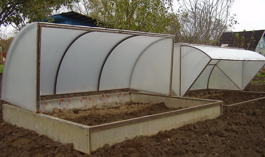 Nasihat berguna! Lebih baik menggunakan polikarbonat sebagai bahan penutup, kerana ia membengkok dengan baik, tetapi pada masa yang sama mempunyai kekuatan tinggi. Filem ini lebih sukar untuk dibetulkan, filem ini lebih kerap pecah dan memerlukan penggantian selepas 1-2 musim.