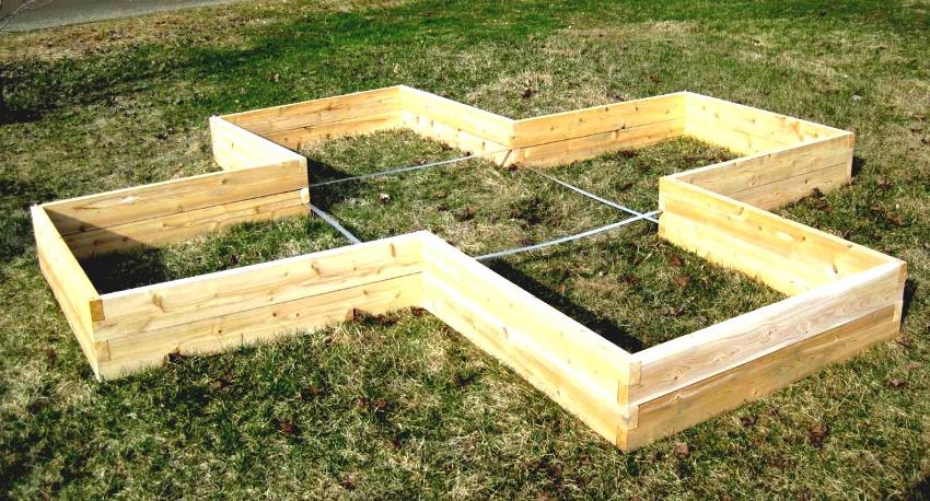 Selepas itu, sepasang papan sepanjang 2 m, dengan sudut yang dipotong di sepanjang tepi, diletakkan pada satah mendatar dan saling bersambung. Rel dipasang di pangkalan untuk mengatur taman masa depan dan dipasang di kedua-dua belah pihak. Dimensi elemen ini ialah 5x40x5 cm. Bahagian piramid yang dihasilkan hendaklah dipasang secara menegak dan sisi kedua dan ketiga harus dipasang di atasnya. Mereka dibuat dengan cara yang serupa.
