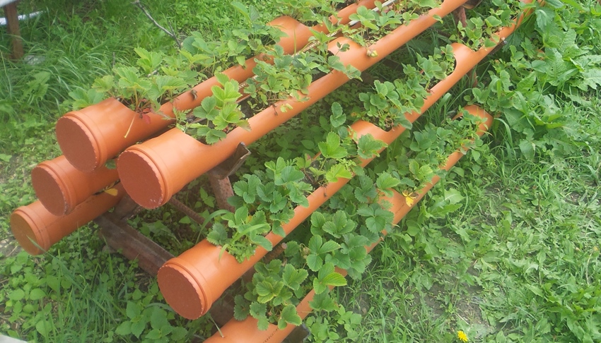 Diameter paip yang besar diperlukan supaya paip yang dipotong separuh dapat menampung jumlah tanah yang diperlukan untuk menanam tanaman. Produk dipotong bersama. Untuk membetulkan tempat tidur dalam kedudukan tegak, lubang harus dibuat di kedua sisi setiap bahagian. Kabel keluli atau garis tebal dilaluinya. Bahagiannya diletakkan di atas yang lain seperti tangga. Bilangan tahap separuh seperti itu tidak terhad.