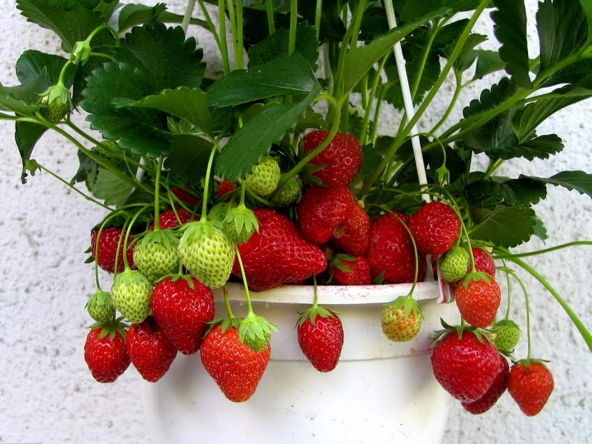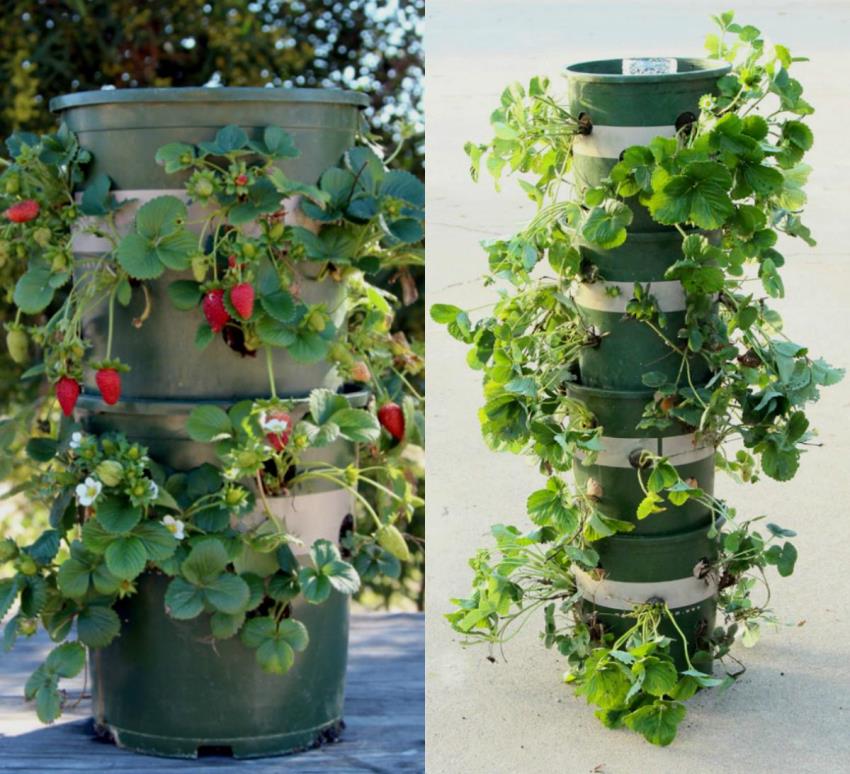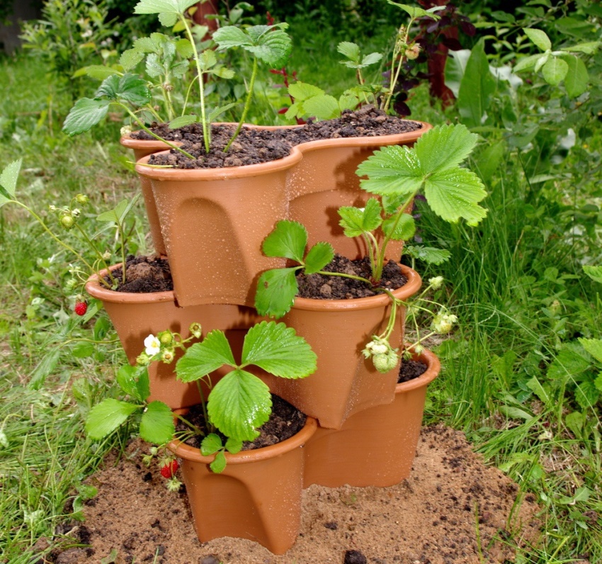 Pot bunga dapat digunakan dengan jayanya untuk menanam strawberi. Reka bentuk sedemikian mempunyai penampilan hiasan. Untuk kerja, produk tanah liat atau plastik sesuai. Hasilnya, reka bentuknya bertingkat. Jumlah tahap tersebut hanya dibatasi oleh keinginan peribadi. Pot dipilih sehingga setiap yang berikutnya mempunyai diameter yang lebih kecil daripada yang sebelumnya. Adalah wajar bahawa perbezaan ukuran antara setiap pasang periuk adalah hampir sama.