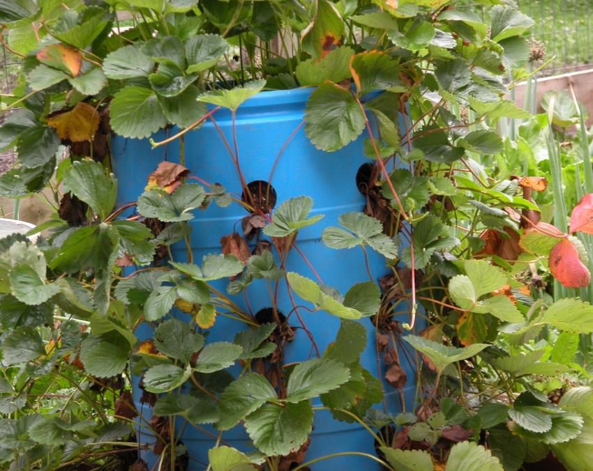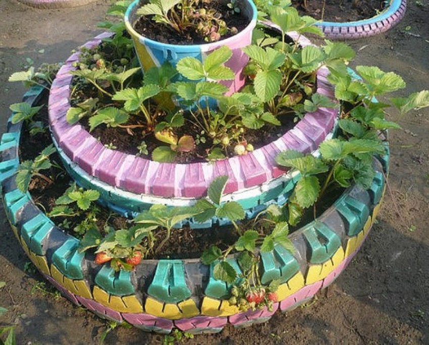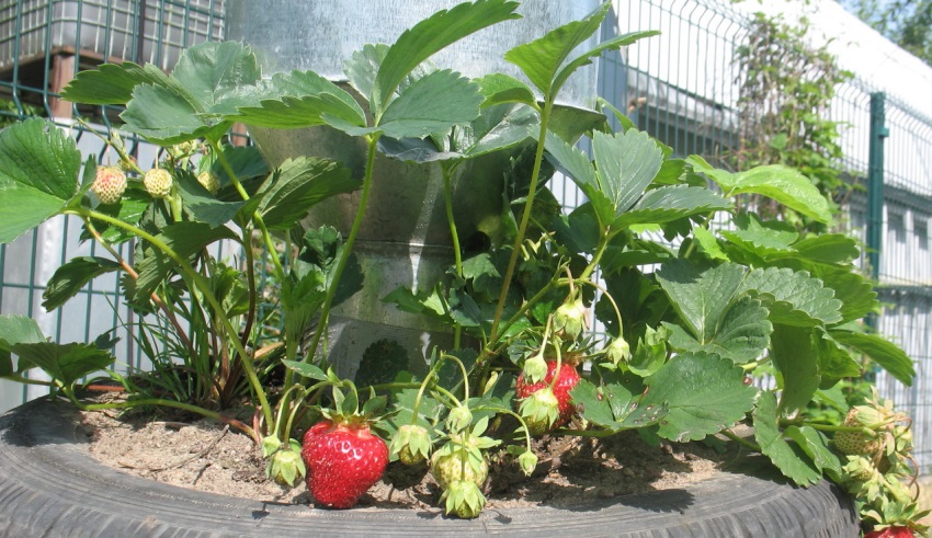 Sekiranya ada tayar kereta lama yang tersisa, anda boleh menggunakannya untuk penanaman strawberi menegak.