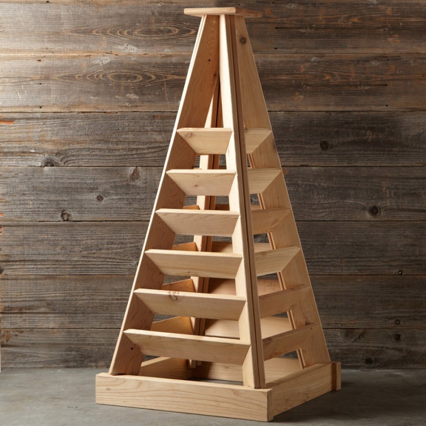 Struktur pelbagai peringkat boleh dibuat dari kotak kayu atau plastik dengan saiz yang berbeza. Mereka ditumpuk satu di atas yang lain dengan penurunan parameter dimensi secara beransur-ansur. Tangga kotak seperti itu boleh dicat dengan warna terang dan diletakkan di sekitar pokok atau tiang.