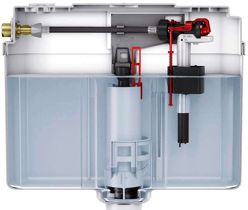 - Ketika air di dalam tangki mencapai had minimum, mekanisme pelepasan dipicu, yang menyekat saluran pembuangan.