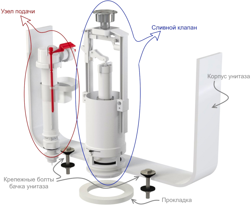 Komponen utama pemasangan tandas adalah penutup yang dipasang di lubang siram. Apabila pengguna menekan pemicu atau butang pelepas, ada daya tarikan yang membuatnya bergerak.