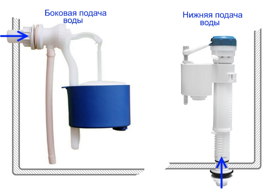 Dengan kaedah penyediaan air ke tangki, jenis kelengkapan dibezakan sebagai lebih rendah, atas, universal