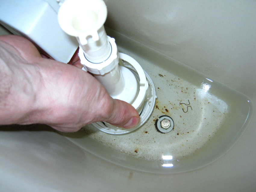 - Pasang mekanisme saliran di tangki di tempat yang ditentukan untuknya.