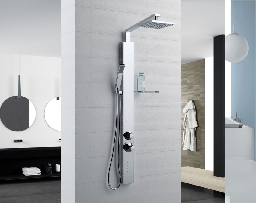 Panel pancuran dibezakan dengan reka bentuk khas. Mereka juga dilengkapi dengan tabung penyiram, selang, pengadun, tetapi mereka sama sekali berbeza - panel rak segi empat tepat dan volumetrik, dilengkapi dengan muncung untuk fungsi urut.