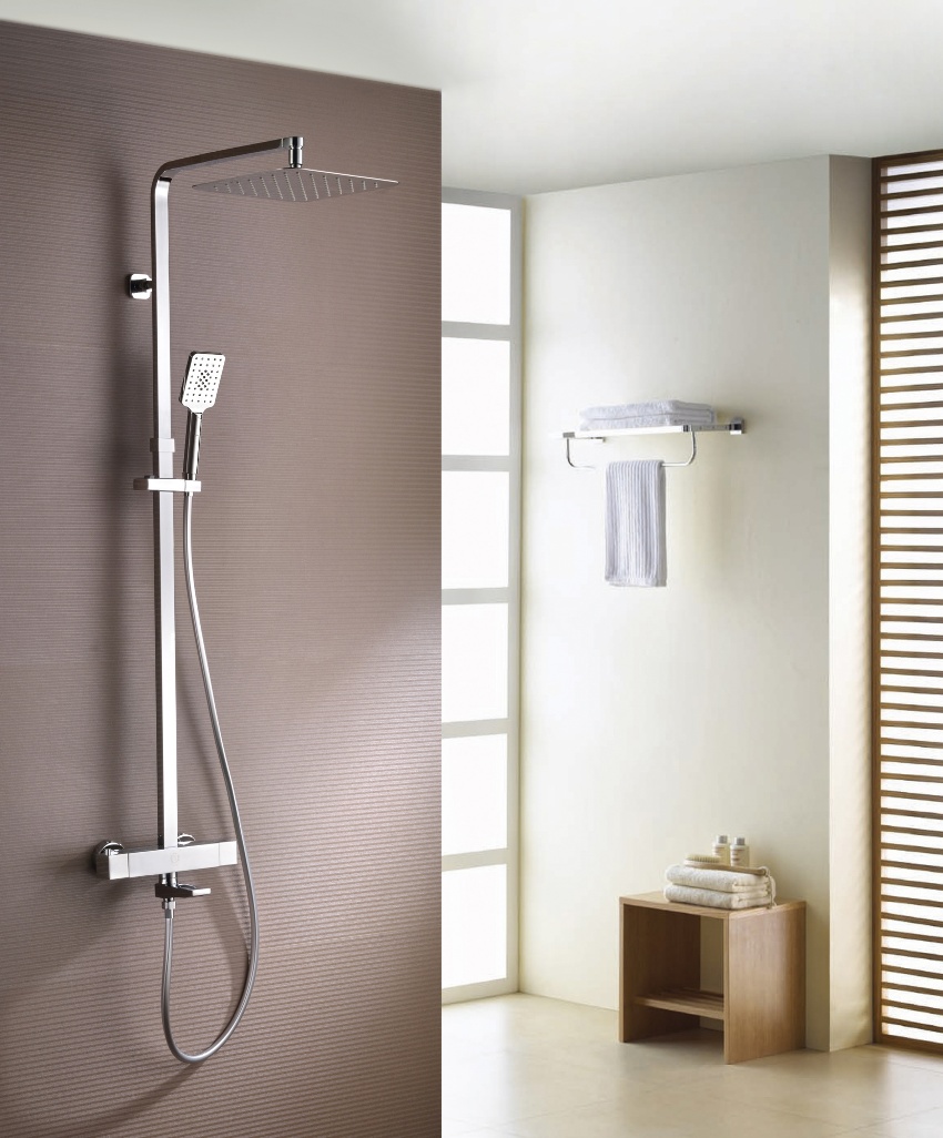 Rak mandi moden dengan termostat sangat popular, di mana suhu air yang ditetapkan secara automatik diatur dan dijaga sepanjang keseluruhan prosedur air. Termostat dipasang di pengadun, ia bertindak balas terhadap perubahan tekanan dan suhu air.