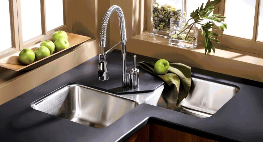 Singki sudut untuk dapur. Kelebihan dan kekurangan. Varieti kerang. Kaedah pemasangan. Bentuk dan dimensi model sinki sudut. Pilihan kabinet sink sudut.