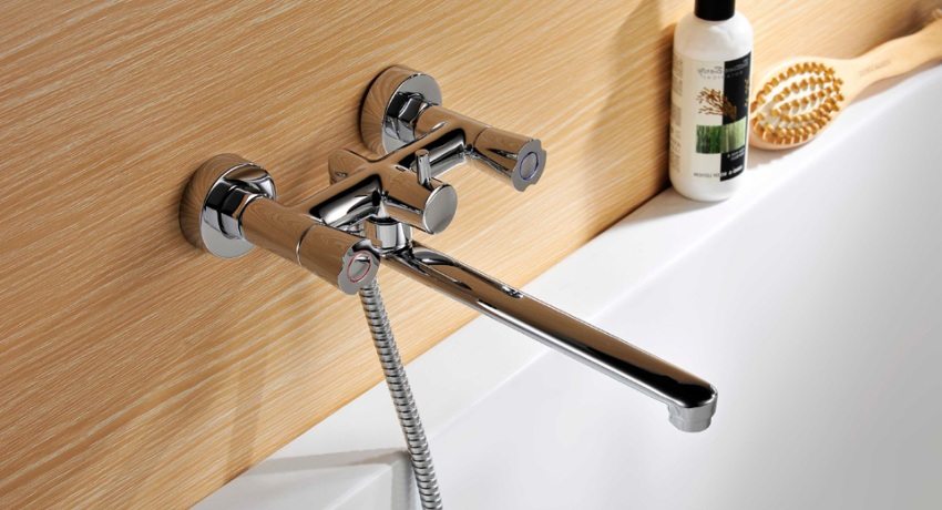 Pengadun mandi dengan muncung panjang. Pelbagai model dari pengeluar yang berbeza. Peranti pengadun. Rak mandi dengan pengadun. Pembaikan diri.