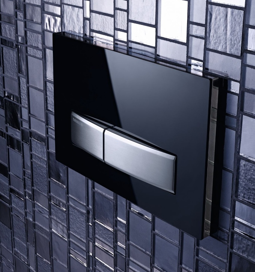 Catatan! Butang flush seperti itu sangat popular ketika menghias bilik mandi dengan gaya moden. Ia digabungkan dengan dalaman berteknologi tinggi dan minimalis.