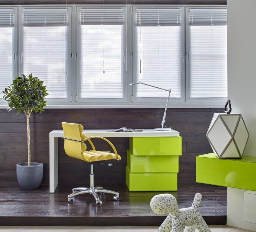 Nasihat berguna! Dengan menggunakan gaya meniru kayu semula jadi di pedalaman, anda perlu memahami bahawa lebihan permukaan kayu akan memberi ruang pada pejabat yang terlalu ketat. Oleh itu, semasa memasang panel kayu, anda perlu memikirkan teknik yang dapat melancarkan momen negatif.