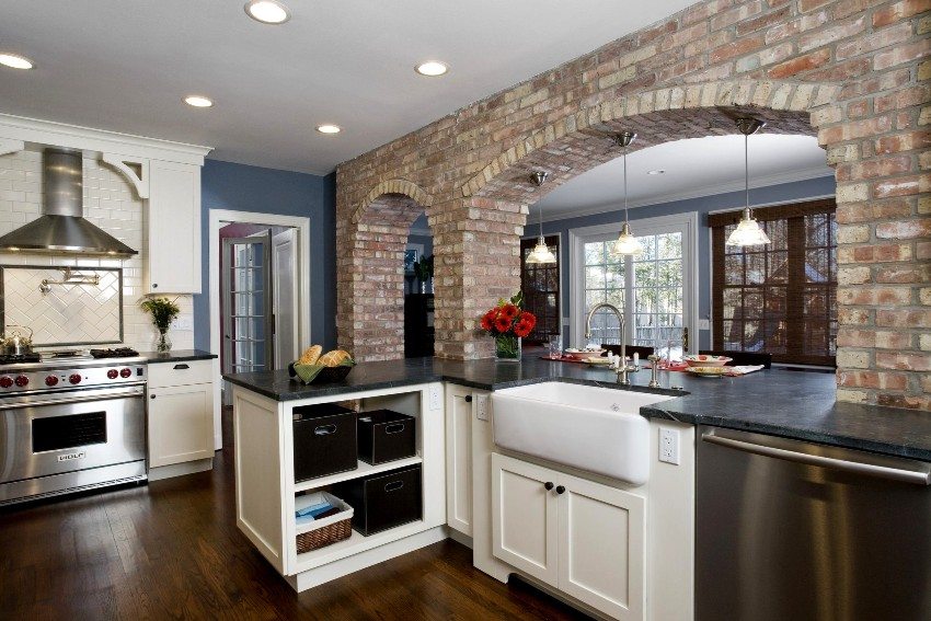 Dinding dan apron kerja dapur dihiasi dengan batu bata "batu bata"