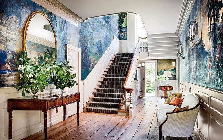 Nasihat berguna! Agar kertas dinding dengan corak yang menjanjikan kelihatan organik dan tidak keluar dari konteks umum, pilih elemen yang akan menghubungkannya. Ini boleh menjadi batu hiasan (serupa dengan yang ditunjukkan) atau lantai yang serupa.