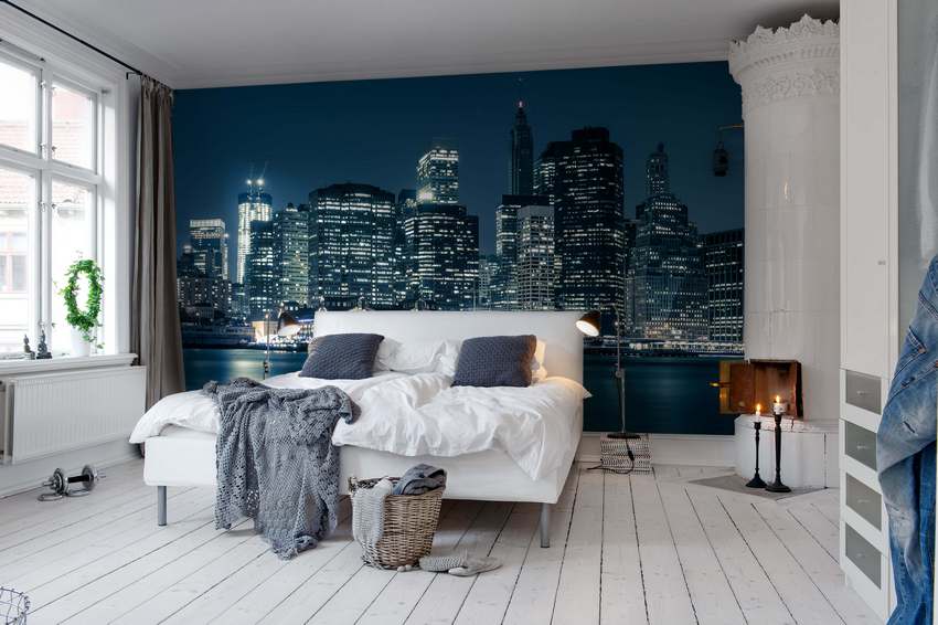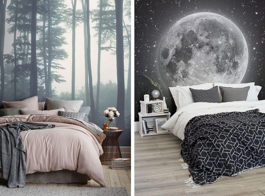 Sekiranya kita bercakap mengenai penggunaan kertas dinding foto di pedalaman di dalam bilik tidur (foto akan menjadi model inspirasi yang sangat baik), warna pastel seperti kuning air atau merah jambu yang sangat halus boleh diterima.