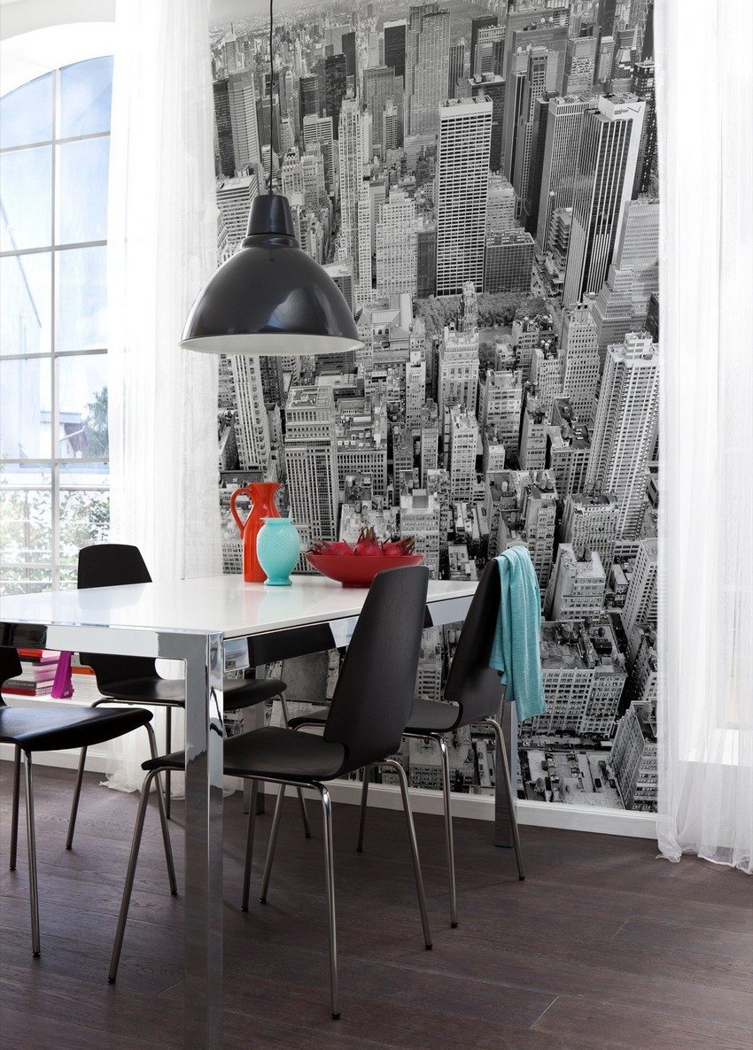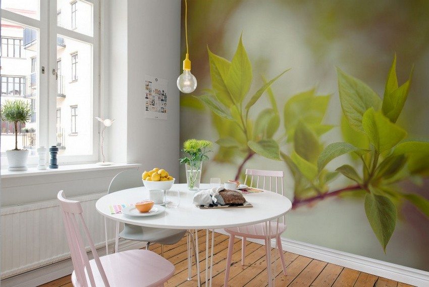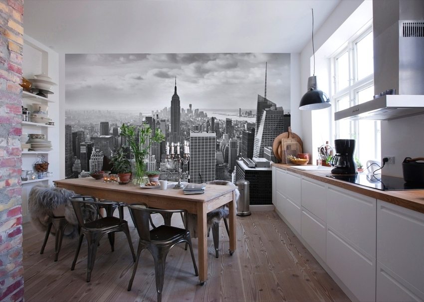 Untuk bilik persegi kecil atau di dapur, kertas dinding dengan gambar besar satu objek di tengah sesuai. Jadi bilik secara visual akan menjadi lebih panjang. Anda boleh yakin dengan ini dengan melihat gambar idea dalaman di dapur. Mural dinding dengan perspektif atau corak yang tidak biasa hampir selalu kelihatan menguntungkan.