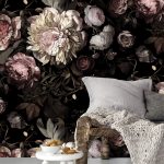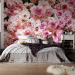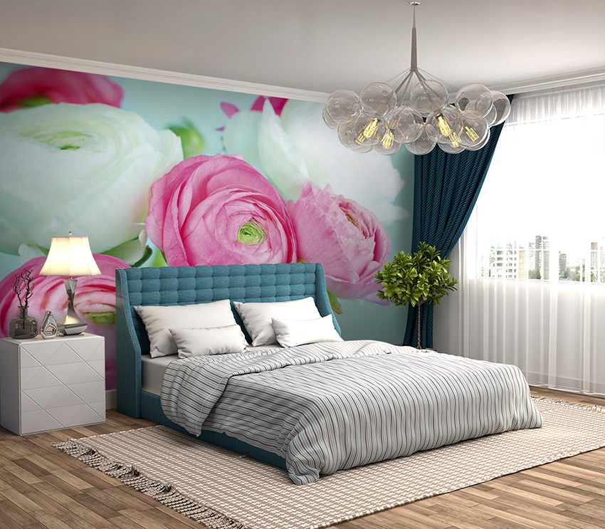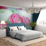 Bunga mawar berikutnya yang paling popular adalah bunga peonies, yang bunga besarnya dikaitkan dengan awan lembut. Bilik tidur, di mana ilustrasi seperti itu terdapat di belakang kepala katil, dipenuhi dengan keceriaan dan ketenangan. Dalam persekitaran ini, akan selalu mudah untuk berehat dan mengikuti hari yang positif. Bunga-bunga lain, gambarnya sering dijumpai di bahagian dalam bilik tidur: