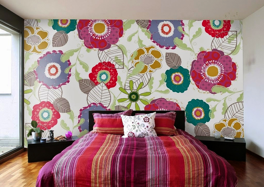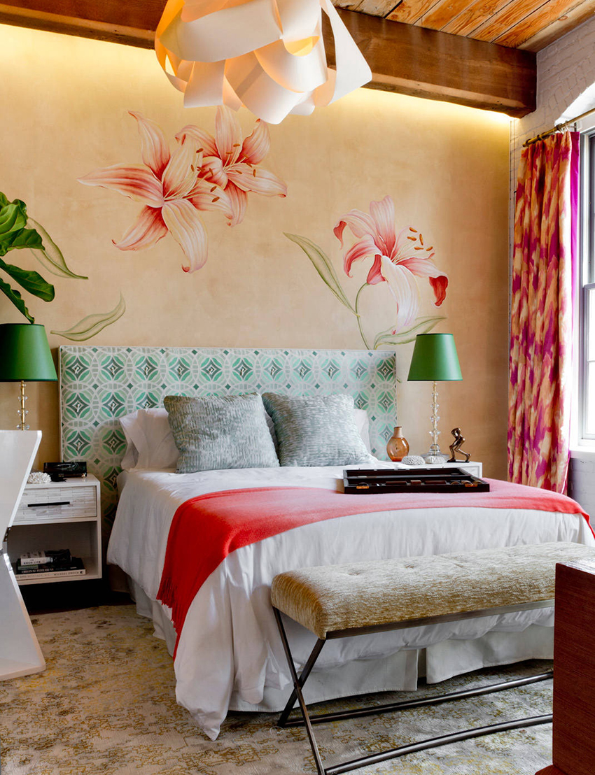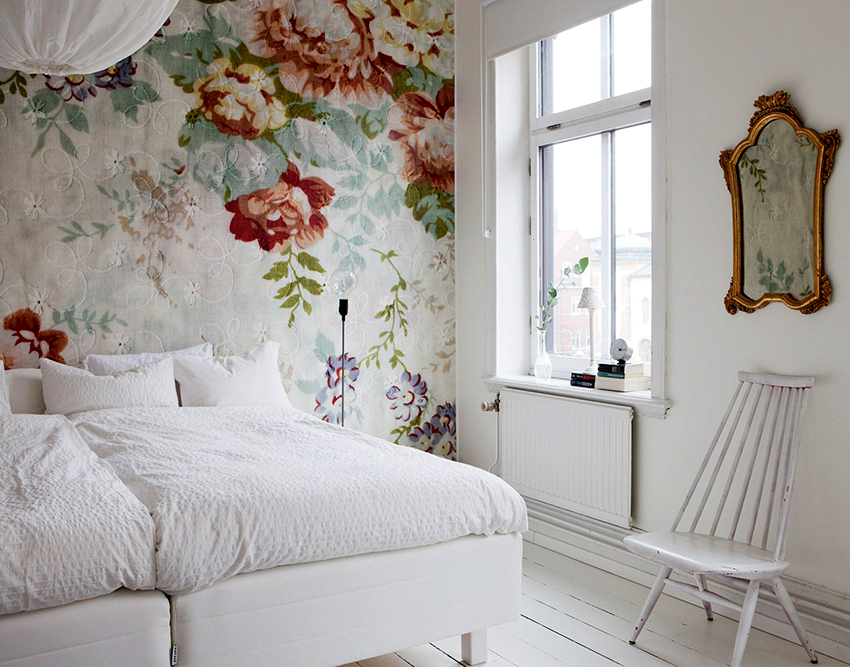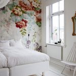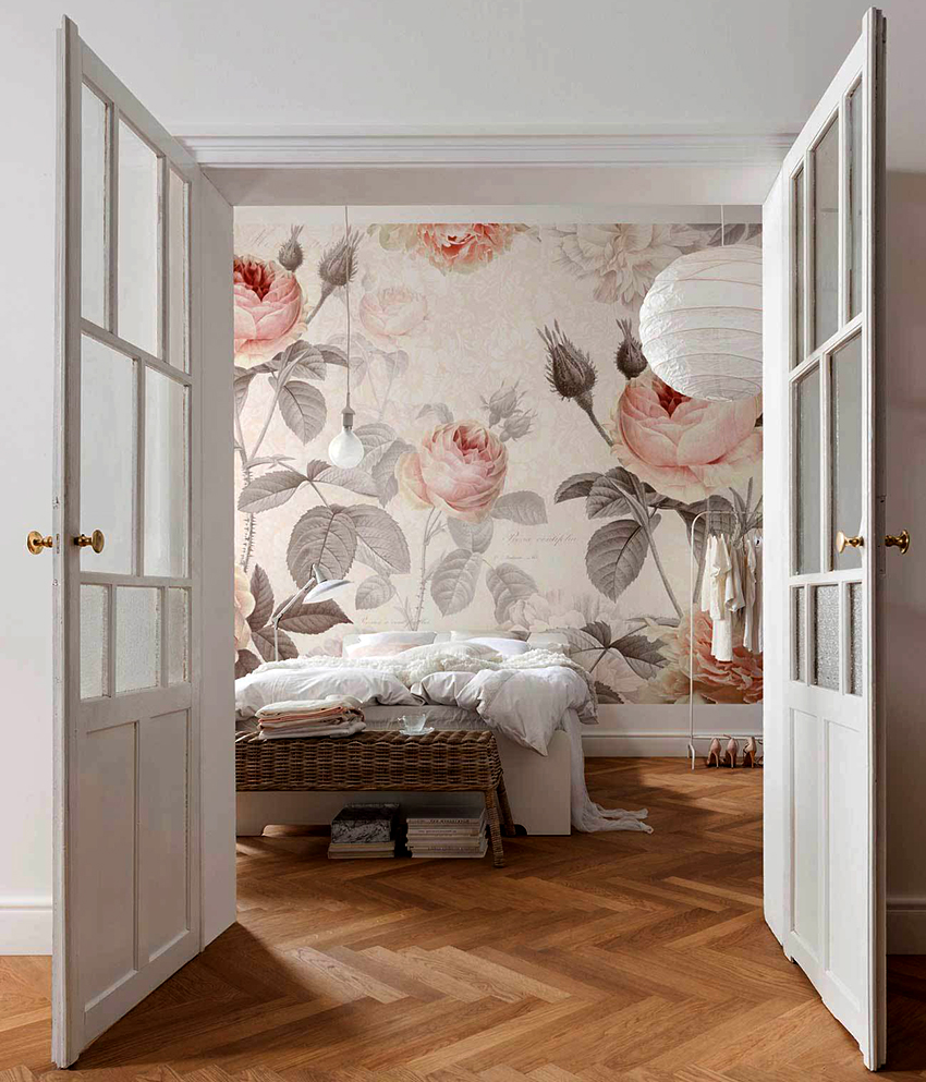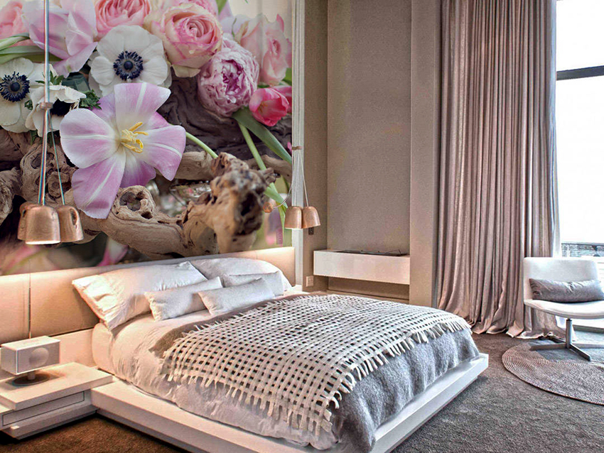 Bunga di kertas dinding boleh berupa gambar atau dicat; di sini sudah semestinya fokus pada pilihan anda sendiri dan gaya bilik tidur.