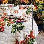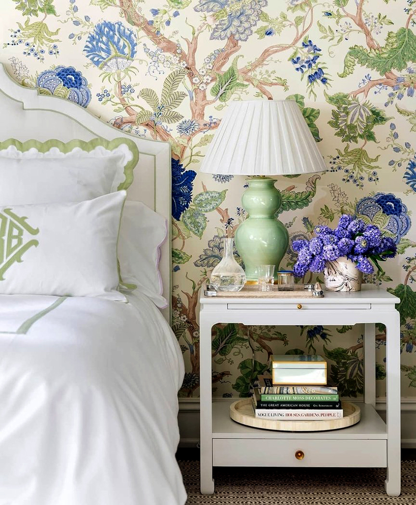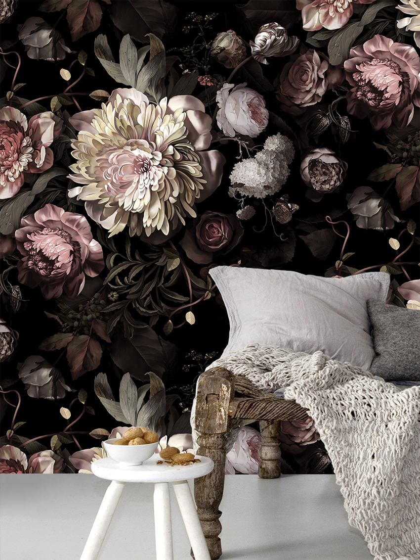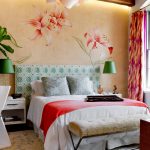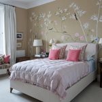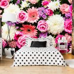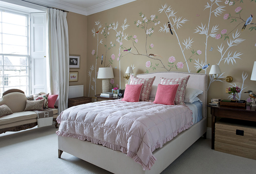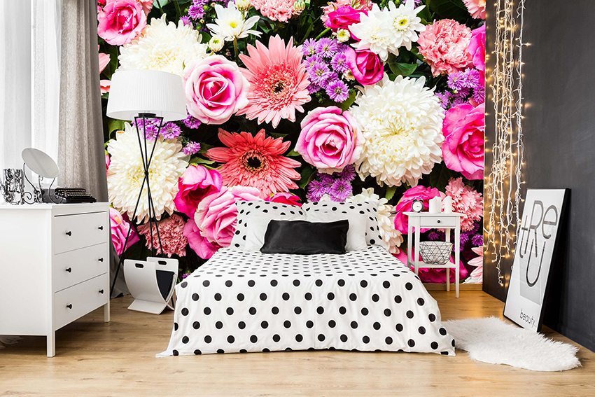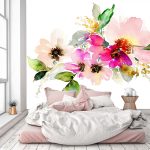 Bunga di kertas dinding boleh berupa gambar atau dicat; di sini sudah semestinya fokus pada pilihan anda sendiri dan gaya bilik tidur.