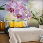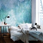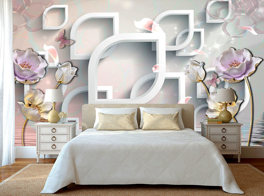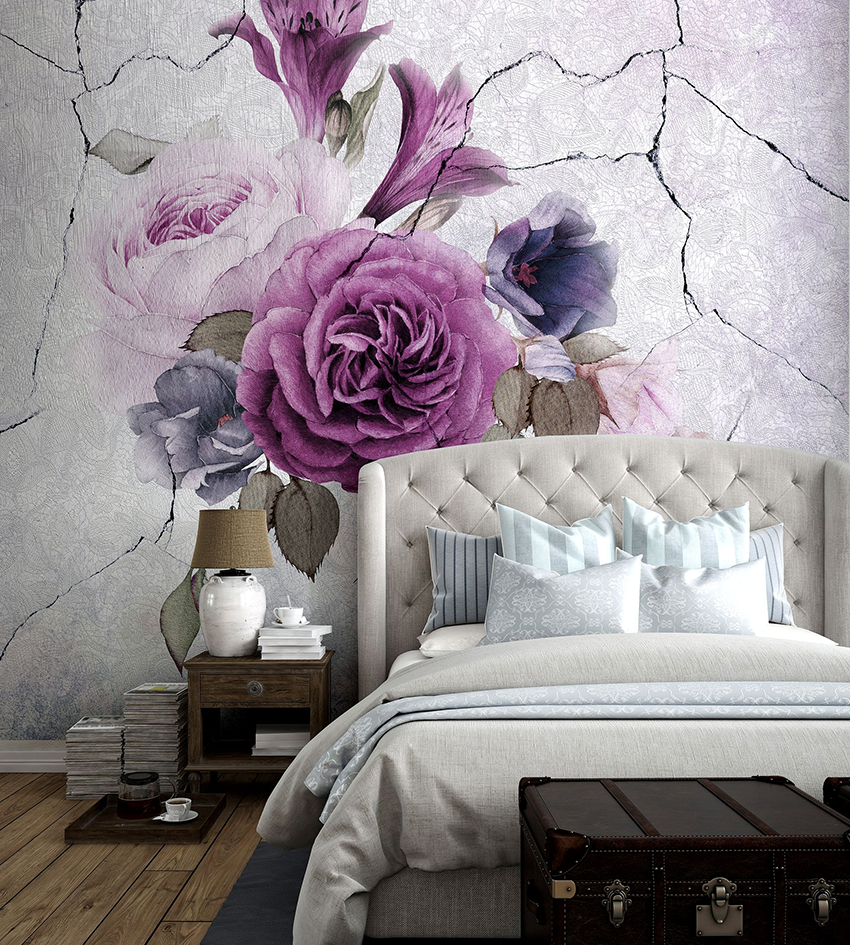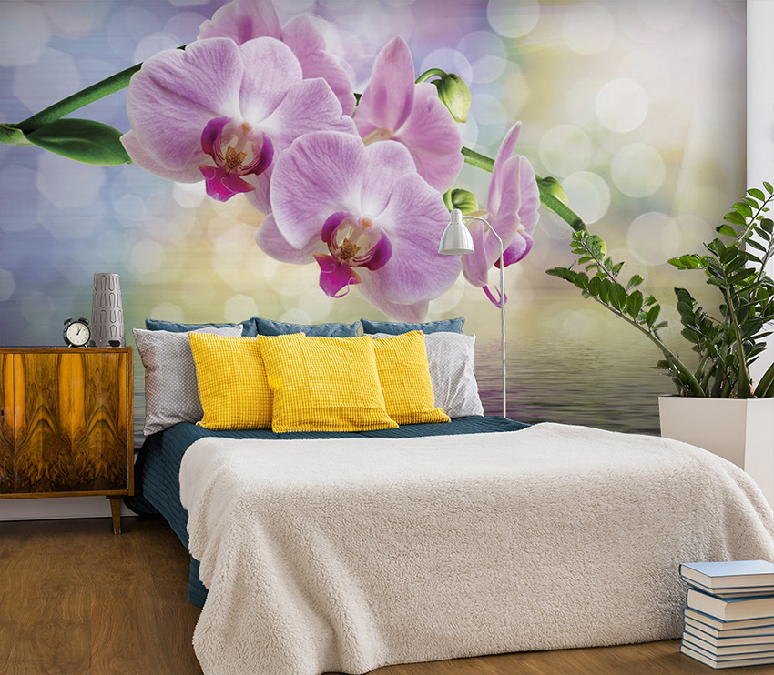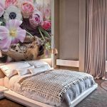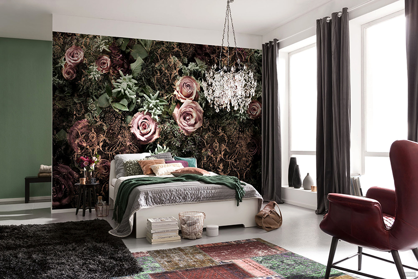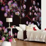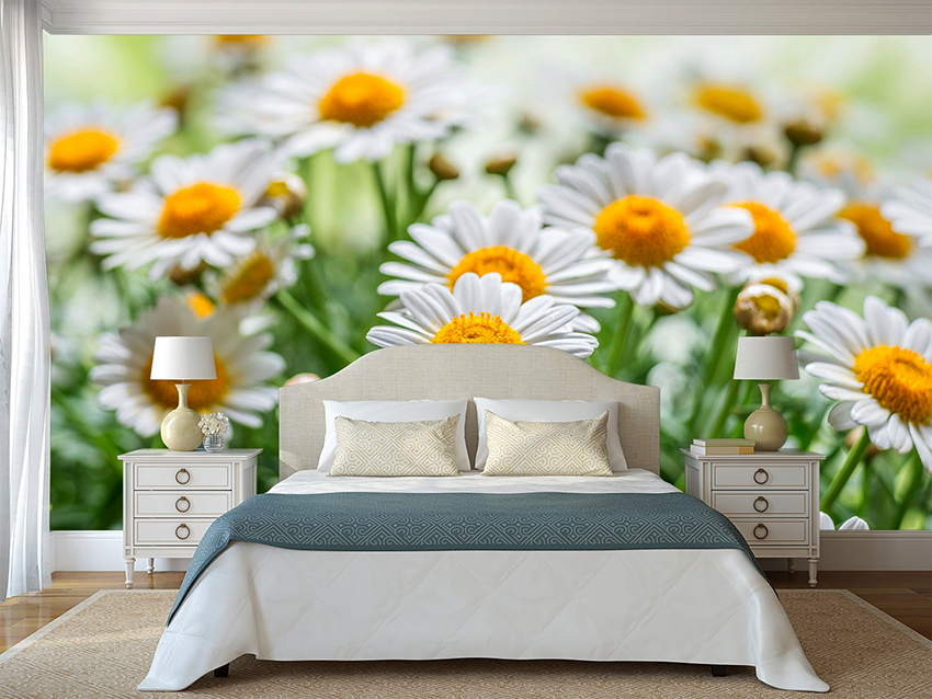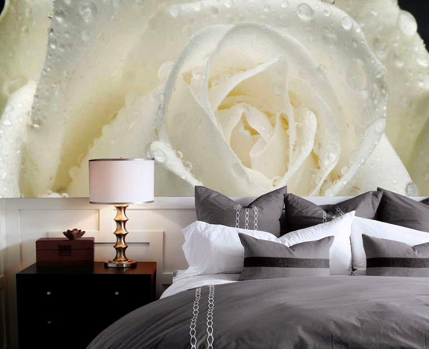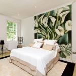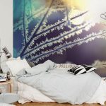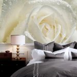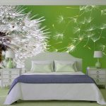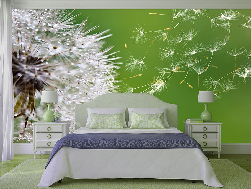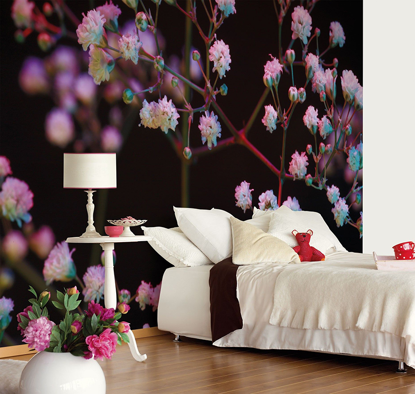 - Di bilik tidur besar, di mana, selain tempat tidur, tidak ada objek dimensi, anda dapat menunjukkan lebih banyak imajinasi dan melekatkan mural dengan gambar yang dibuat menggunakan fotografi makro. Tidak digalakkan menggunakan gambar kecil di ruang terbuka yang besar yang akan hilang di ruang angkasa.
