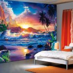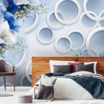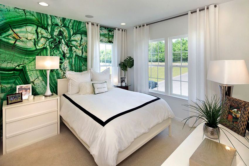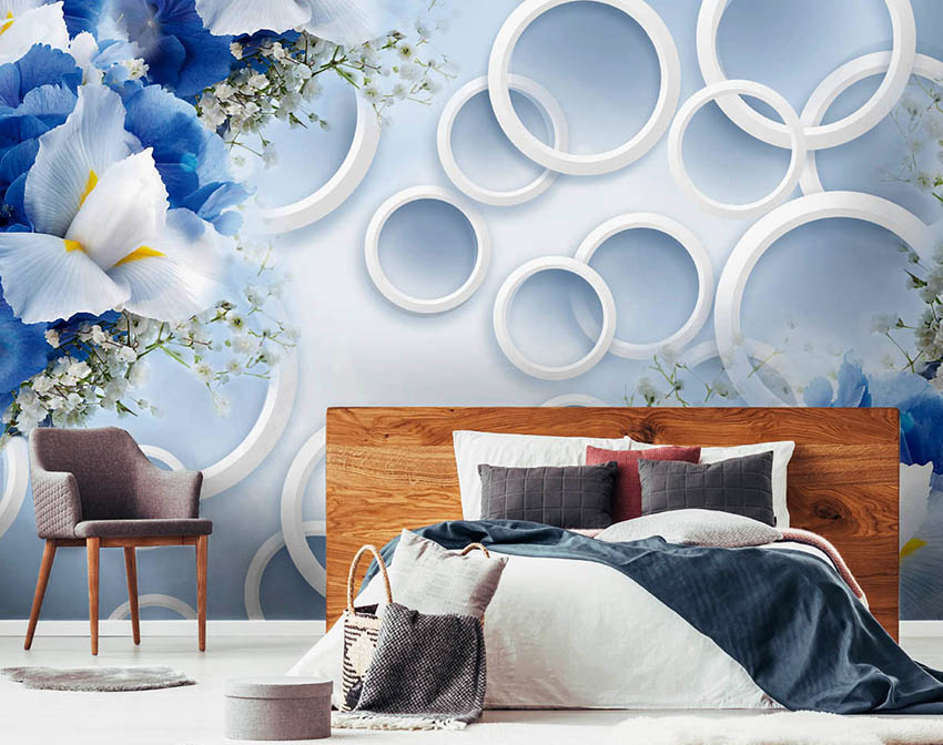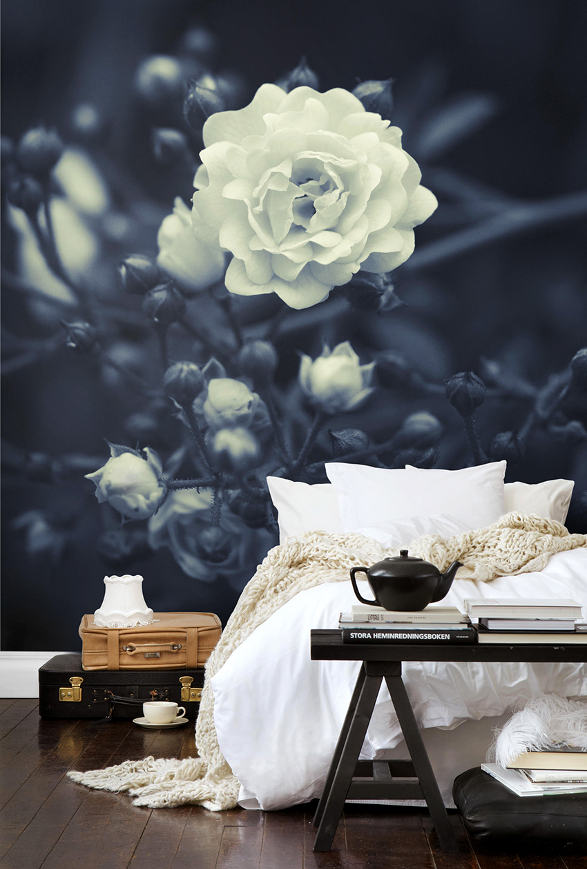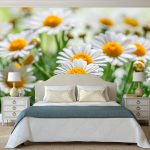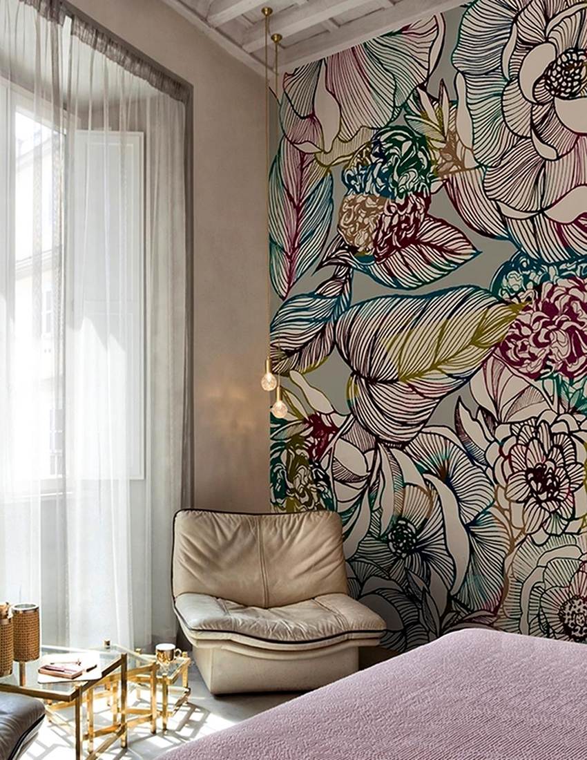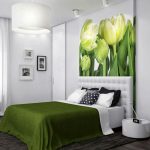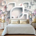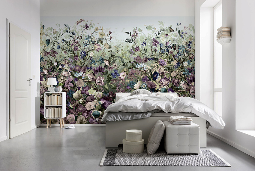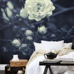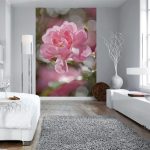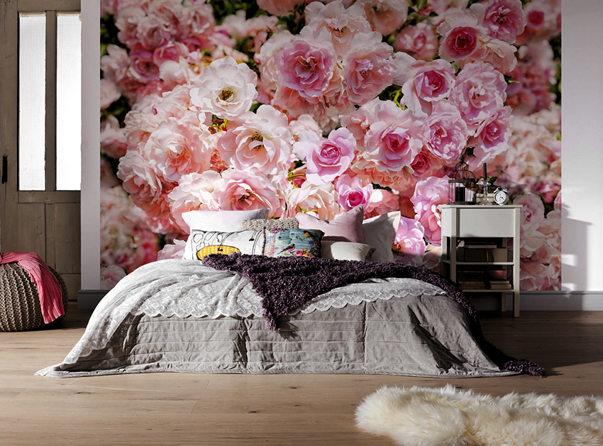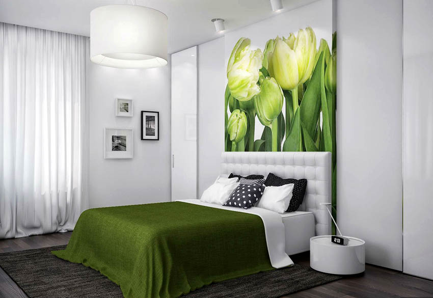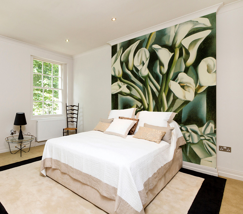 - Di bilik tidur besar, di mana, selain tempat tidur, tidak ada objek dimensi, anda dapat menunjukkan lebih banyak imajinasi dan melekatkan mural dengan gambar yang dibuat menggunakan fotografi makro. Tidak digalakkan menggunakan gambar kecil di ruang terbuka yang besar yang akan hilang di ruang angkasa.