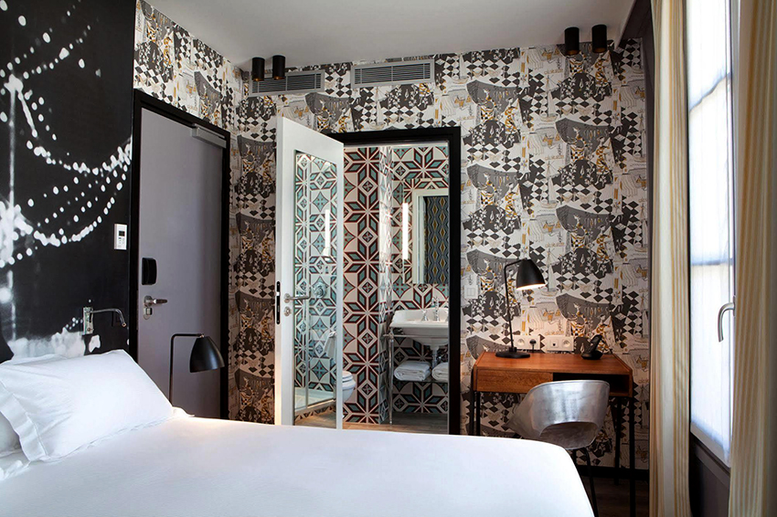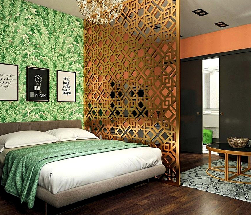- Apabila menggabungkan kertas dinding dengan corak besar dan pilihan monokromatik, anda boleh melakukan pengezonan yang kompeten di dalam bilik dan memisahkan zon dengan fungsi yang berbeza.