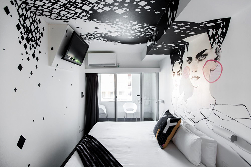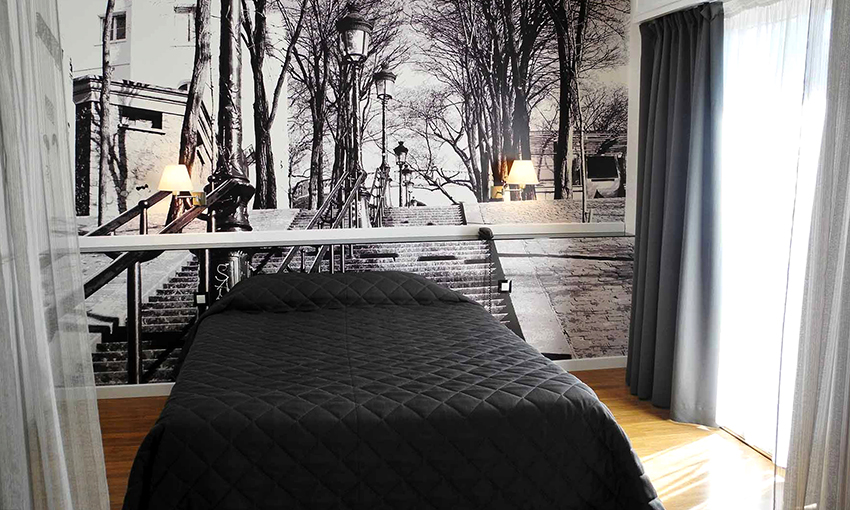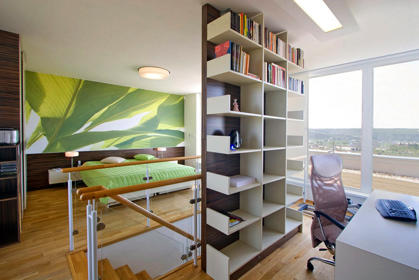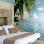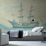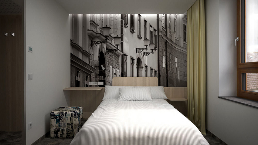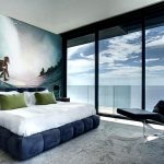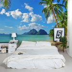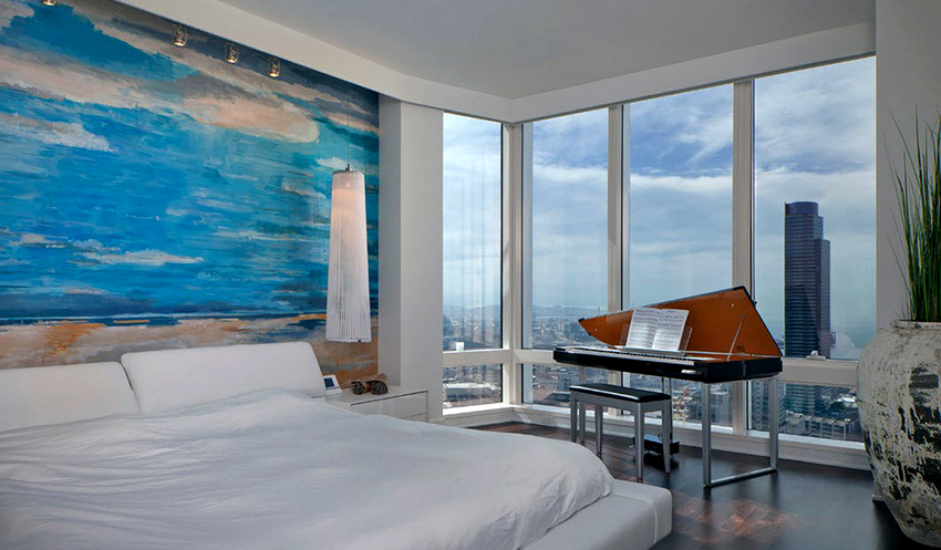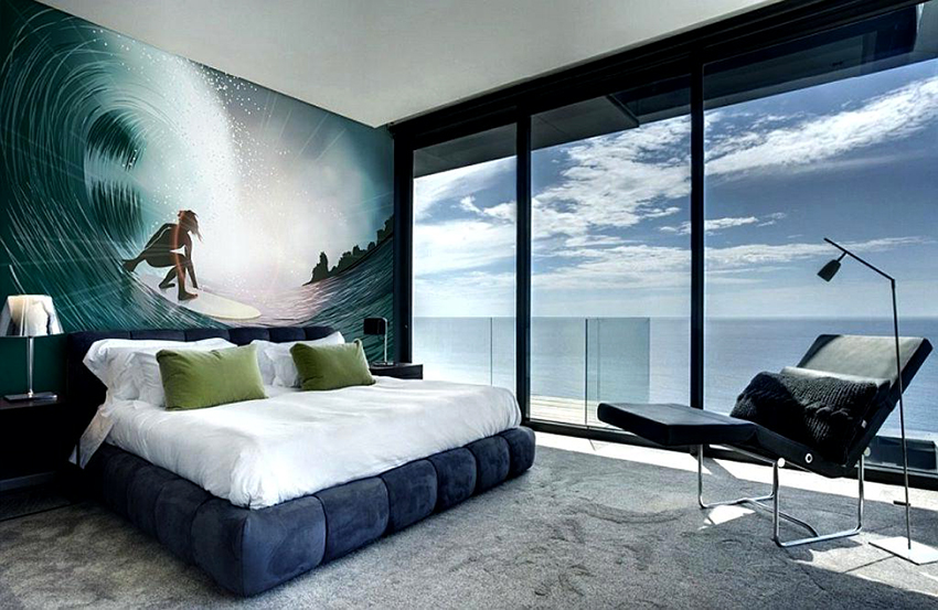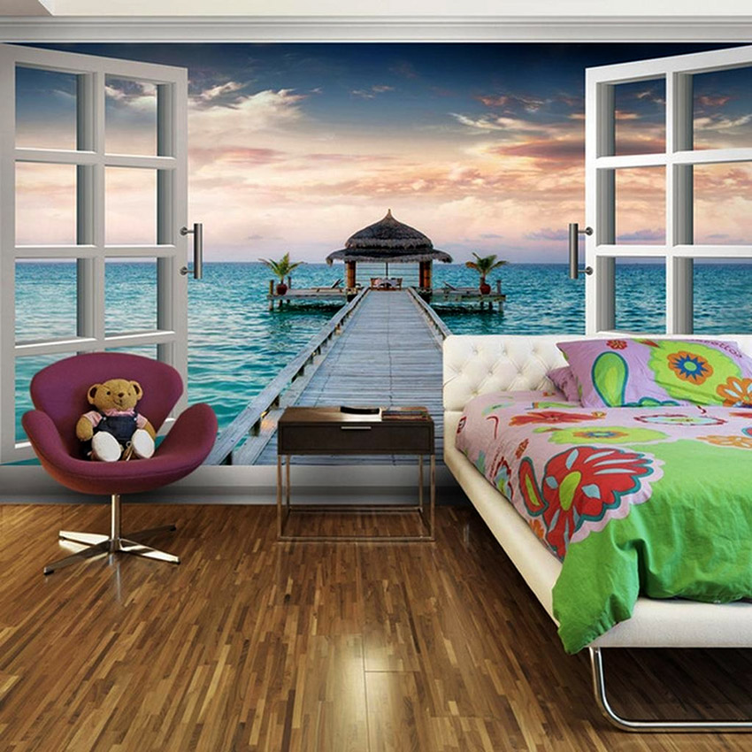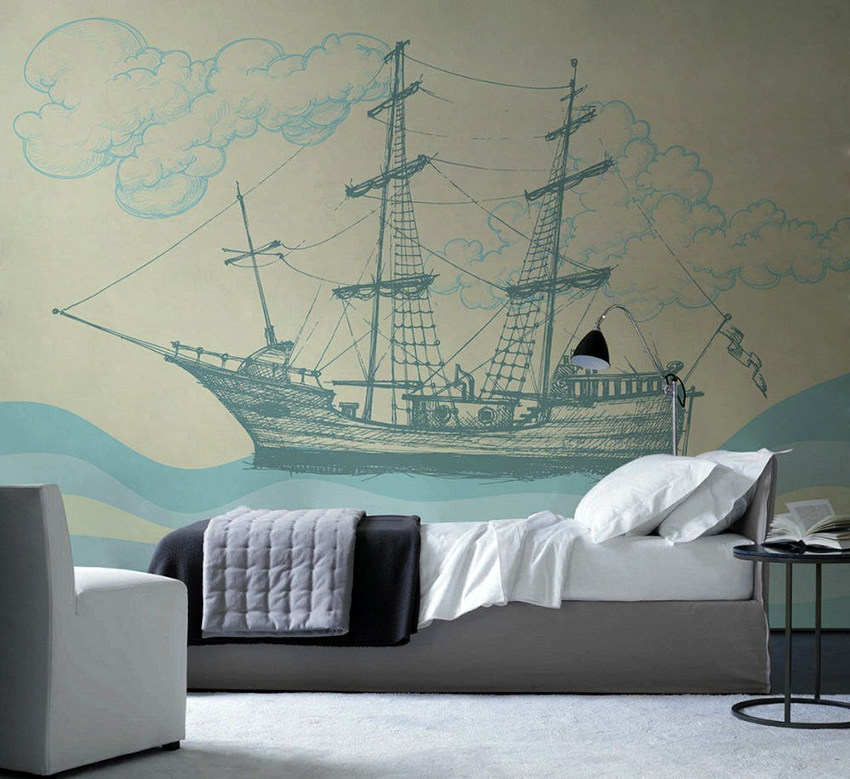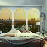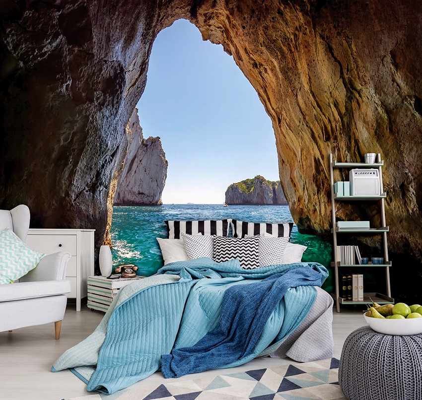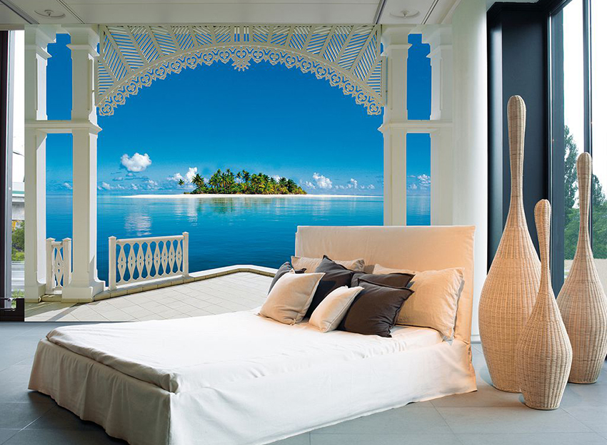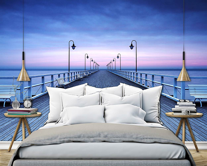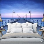 - Dengan menampal mural dinding yang menggambarkan balkoni, teras atau geladak kapal di sisi tingkap, anda boleh membuat kesan ruang yang tidak berkesudahan dan memberikan eksklusiviti bilik tidur.