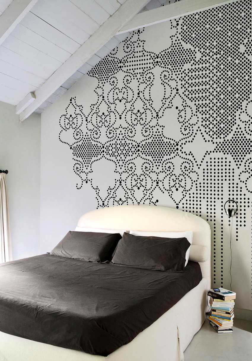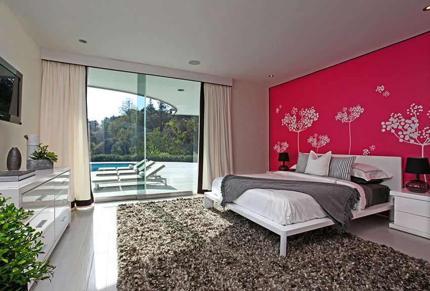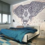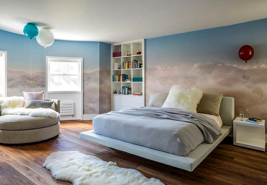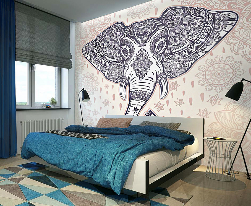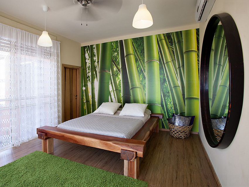 Secara tradisinya, adalah kebiasaan memasang wallpaper foto dengan corak di atas kepala katil, tetapi peraturan ini tidak menentukan, jadi anda sering dapat melihat kertas dinding foto di dinding lain, di siling atau bahkan di pintu. Sekiranya anda memilih gambar yang tepat, anda boleh membebaskan bilik dari hiasan yang tidak perlu dan menyesuaikan keadaan.