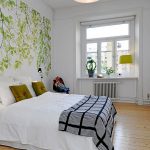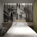 Sekiranya anda tertanya-tanya kertas dinding mana yang harus dipilih untuk bilik tidur kecil, maka anda perlu memberi tumpuan kepada pilihan yang menimbulkan kesan ketiadaan dinding. Jadi, di permukaan, anda dapat mensimulasikan tingkap atau bahkan menggambarkan balkoni dengan pemandangan. Teknik ini akan membolehkan anda memindahkan salah satu dinding secara visual dan mengisi ruangan secara visual dengan kelantangan. Dengan menggunakan kertas dinding dengan gambar yang berbeza, anda dapat membuat kesan kehadiran ceruk, bukaan atau ceruk yang akan membantu memperbetulkan geometri bilik tidur. Ruang tambahan di kamar tidur kecil dapat dibuat menggunakan lukisan yang menggambarkan bidang yang membentang ke kejauhan, atau panorama lanskap gunung yang jauh.