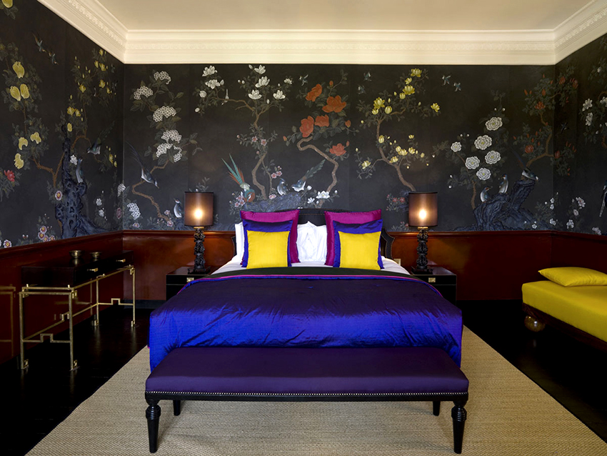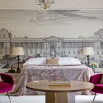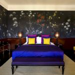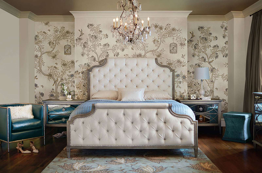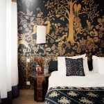 - Dengan menggunakan corak, pelbagai monogram, keriting dan tenunan pada kertas dinding, anda boleh mengubah bilik tidur menjadi dewan teater yang sebenar. Sekiranya kertas dinding dilengkapi dengan bantuan burgundy, warna biru, elemen hiasan emas ditambahkan, maka bilik tidur akan kelihatan seperti istana.