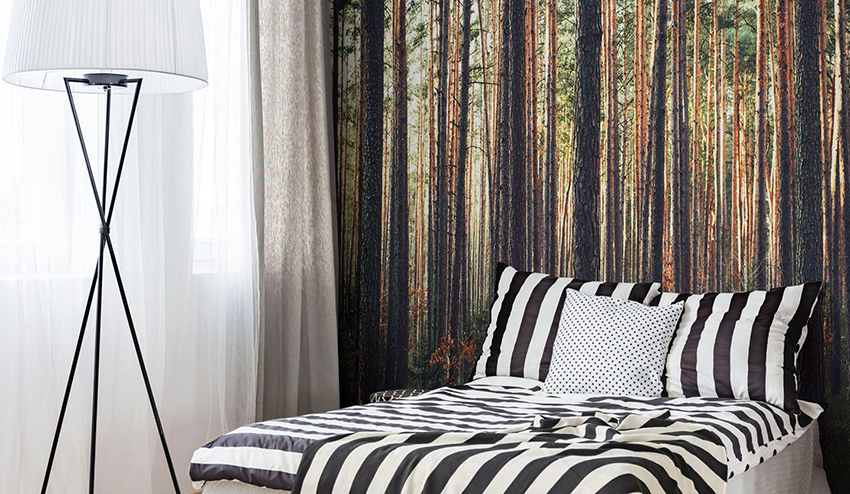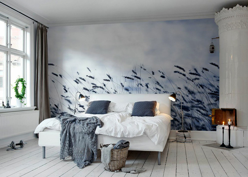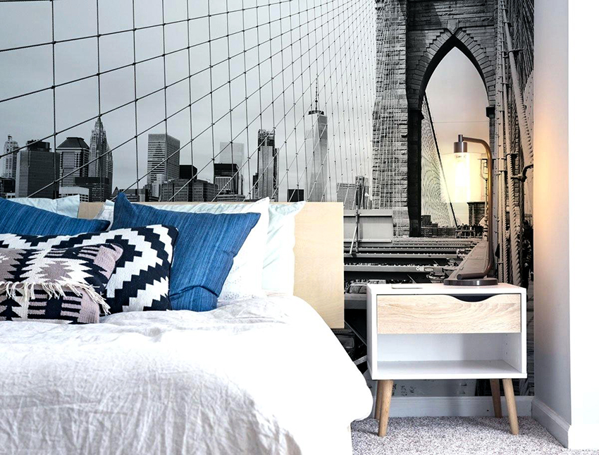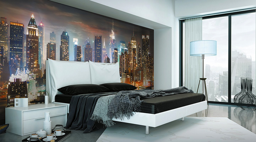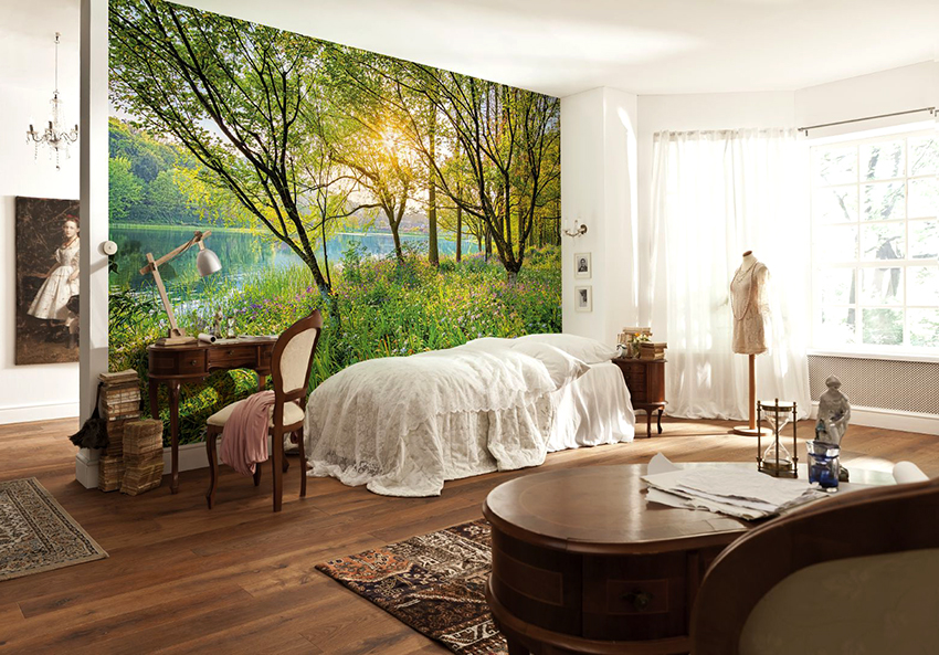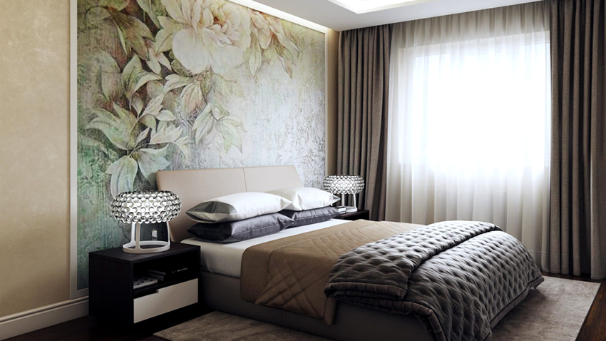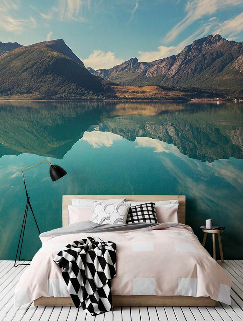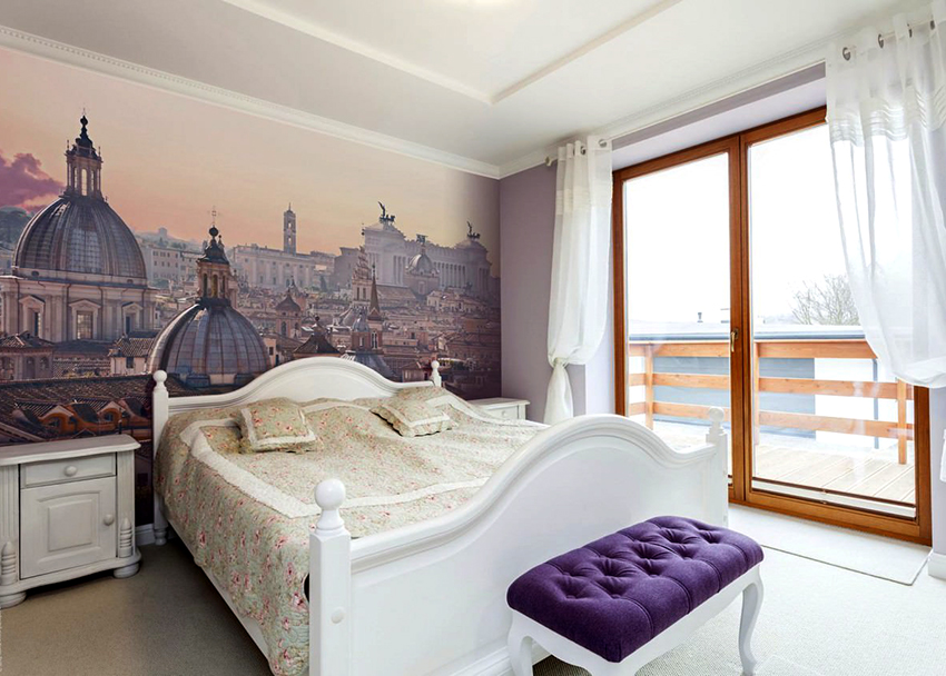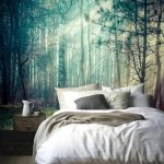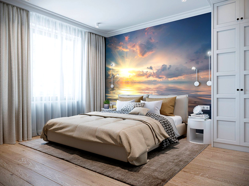 Kertas dinding foto di bilik tidur: pilihan produk bergantung pada kaedah pencetakan dan pemilihan format