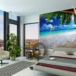 Gambar untuk kertas dinding biasanya dibezakan oleh pelbagai warna yang digunakan, di mana terdapat warna neutral asas. Di bilik tidur moden, warna abu-abu atau perak yang neutral semakin banyak digunakan, yang dapat dicairkan dengan kertas dinding foto lanskap berwarna hijau atau zaitun. Adalah tepat untuk melengkapkan dinding beige, berpasir dan putih dengan pemandangan laut atau menggunakan kertas dinding dengan flamingo yang berdiri di belakang latar tasik biru. Hasilnya, bilik akan menjadi lebih lapang dan segar.