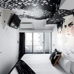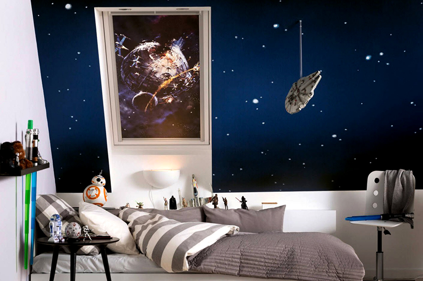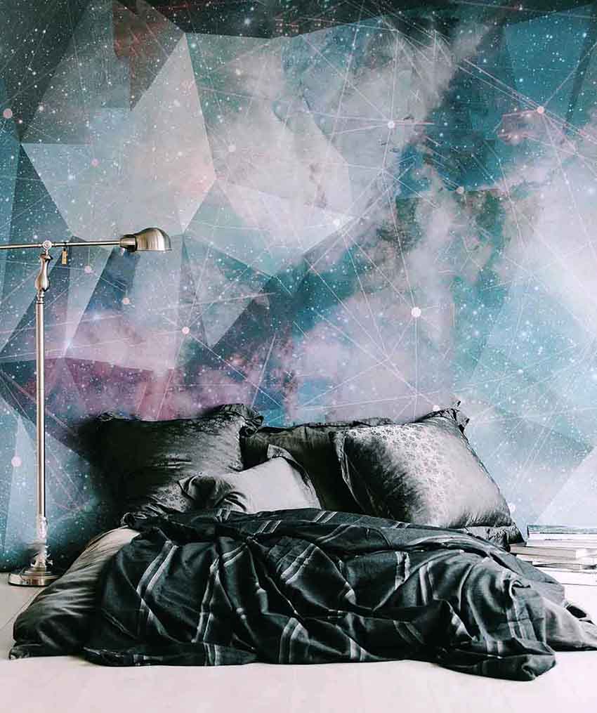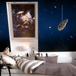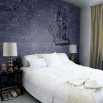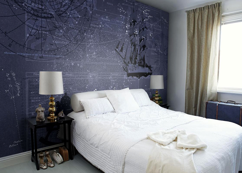 Nasihat berguna! Teknologi moden membolehkan anda membuat kertas dinding dengan kesan cahaya yang akan membantu menghiasi reka bentuk bilik tidur anda dengan gambar langit berbintang yang terang atau bulan bersinar yang menakjubkan.