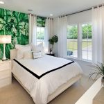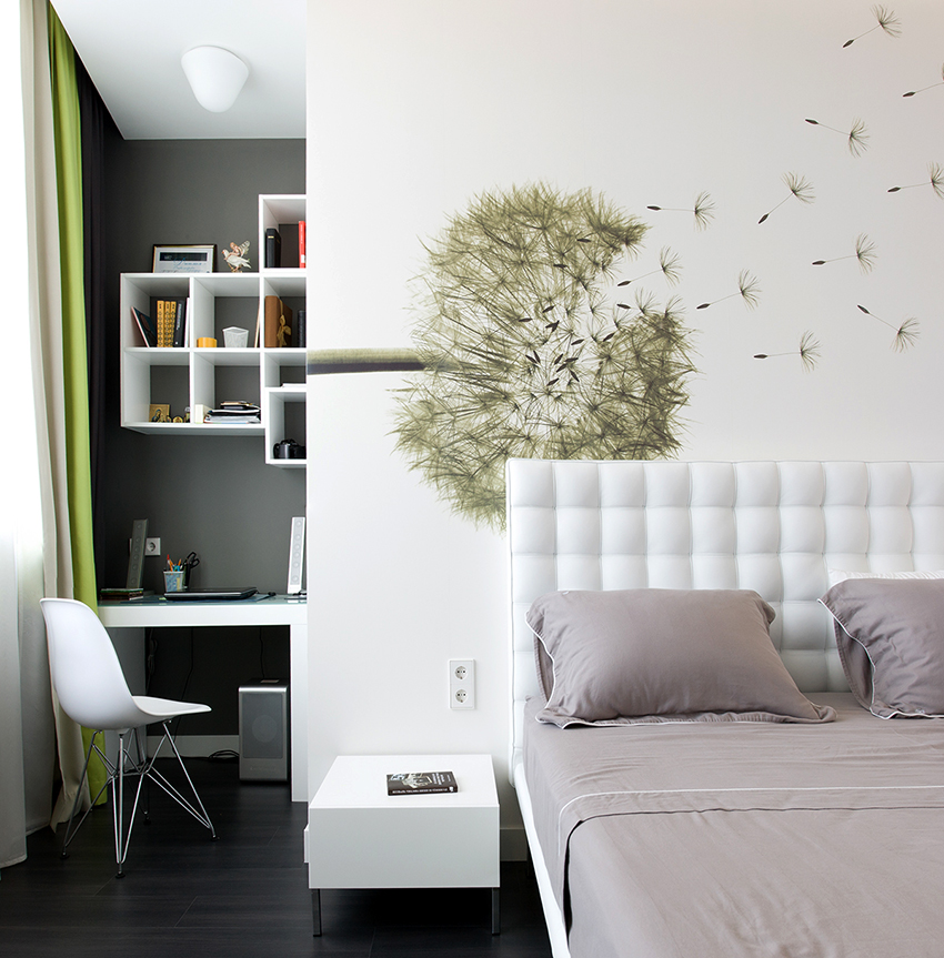Kertas dinding warna neutral dengan hiasan besar tidak cepat bosan, yang utama adalah tidak melengkapkan dinding seperti itu dengan perincian kecil. Dandelion dengan kesan biji terbang kelihatan cantik luar biasa pada kertas dinding putih di bilik tidur. Peraturan lain untuk memilih warna: