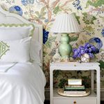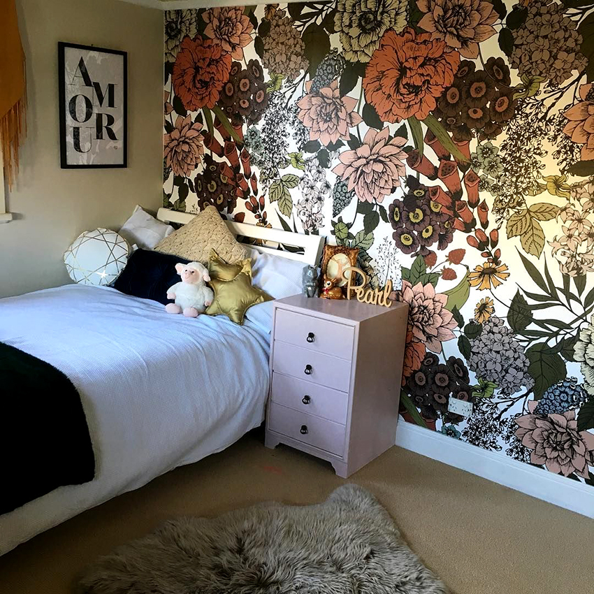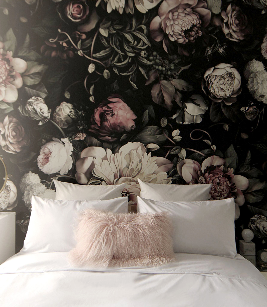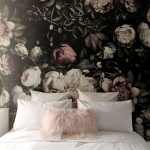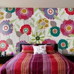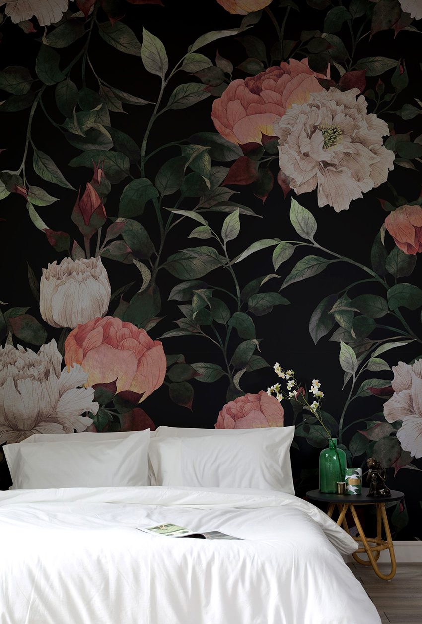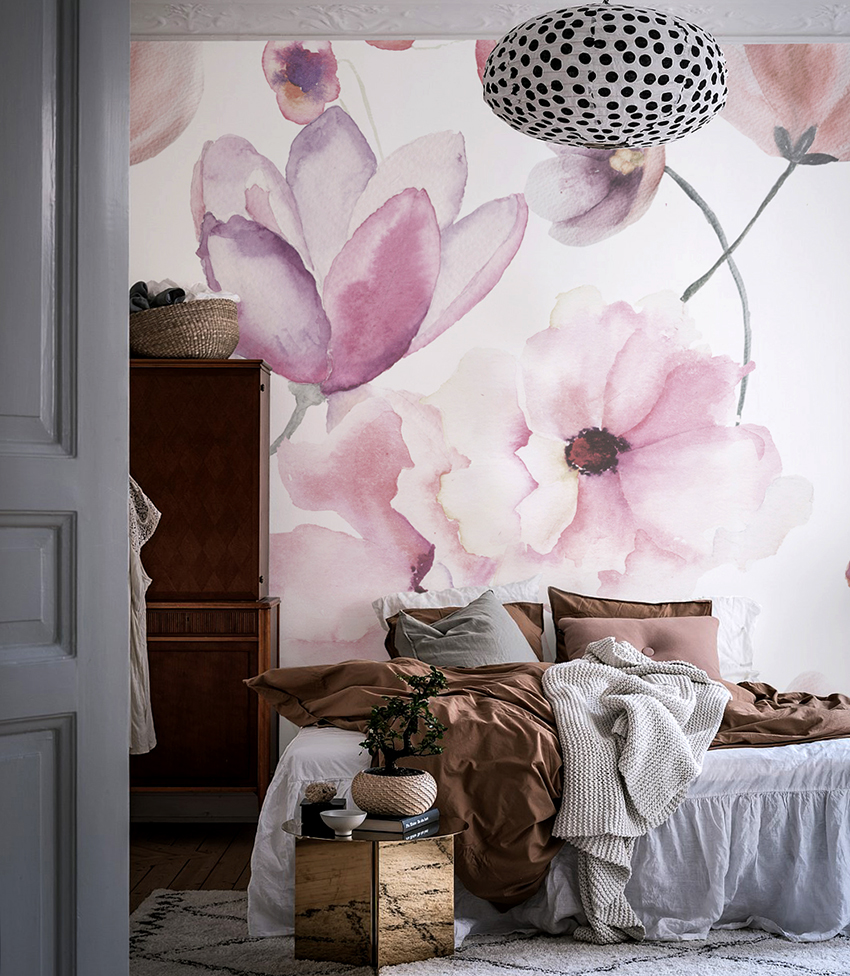 Bunga di kertas dinding gambar di bilik tidur di atas katil: foto reka bentuk menarik