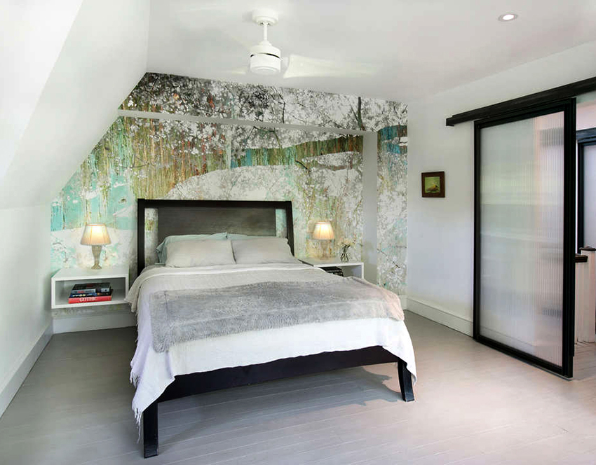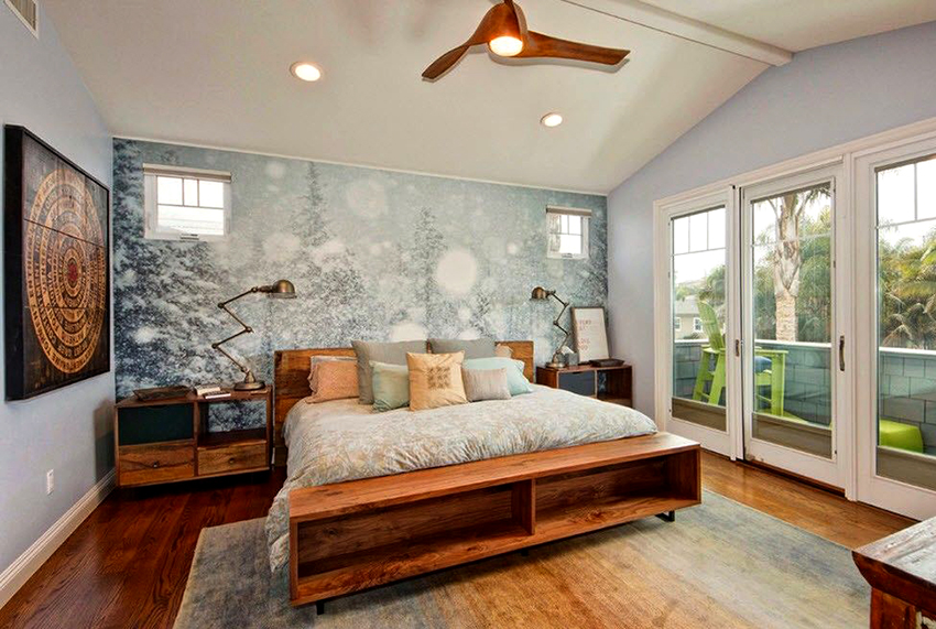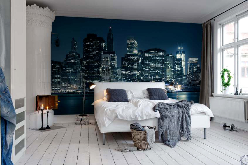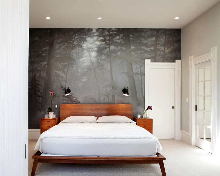 Ciri-ciri menggunakan kertas dinding foto di bilik tidur: foto di pedalaman
