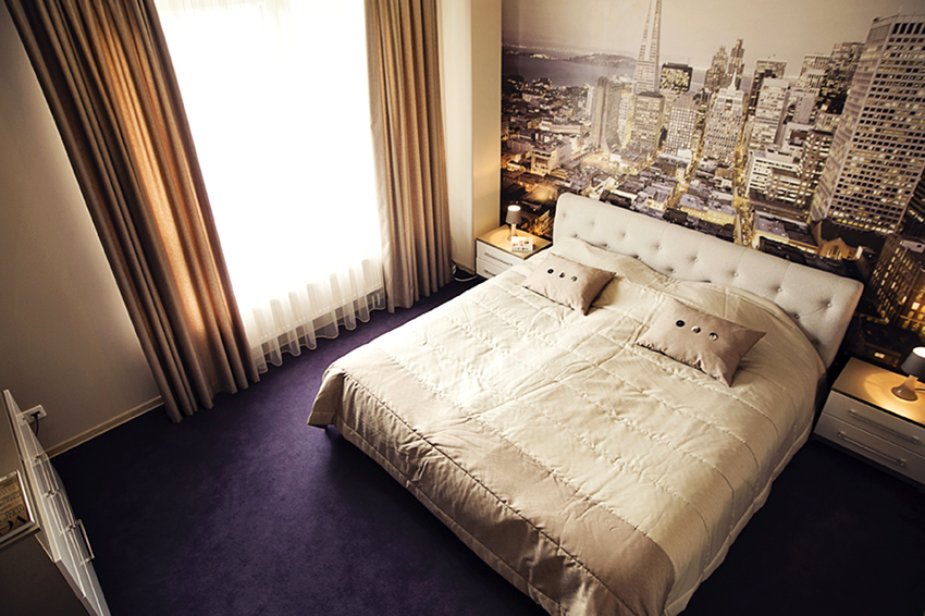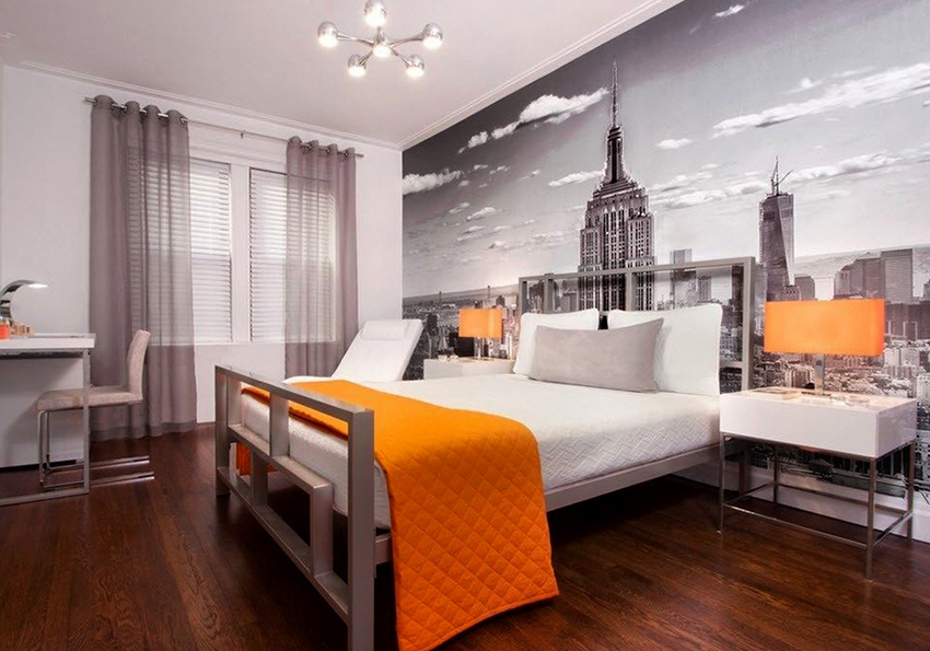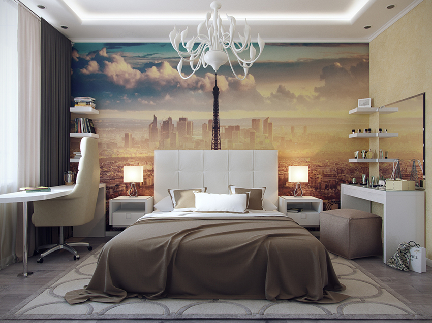 Kertas dinding foto di bilik tidur akan menjadi salah satu teknik spektakuler yang mewujudkan dalaman yang unik
