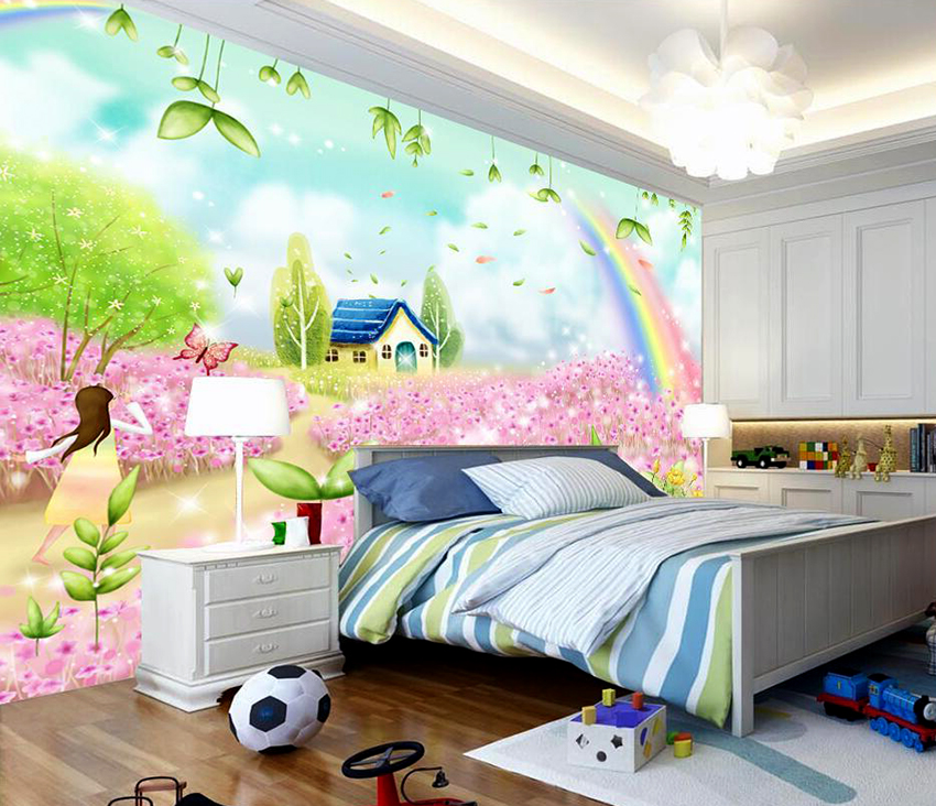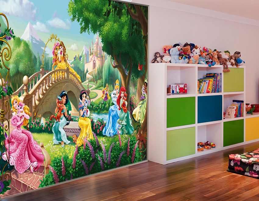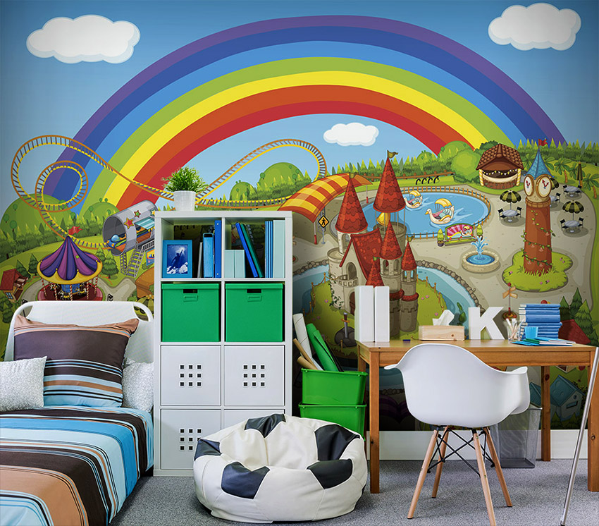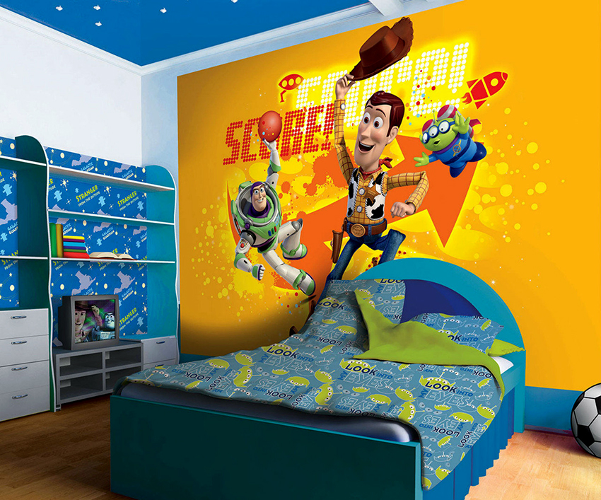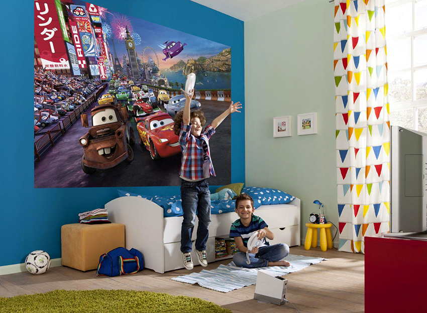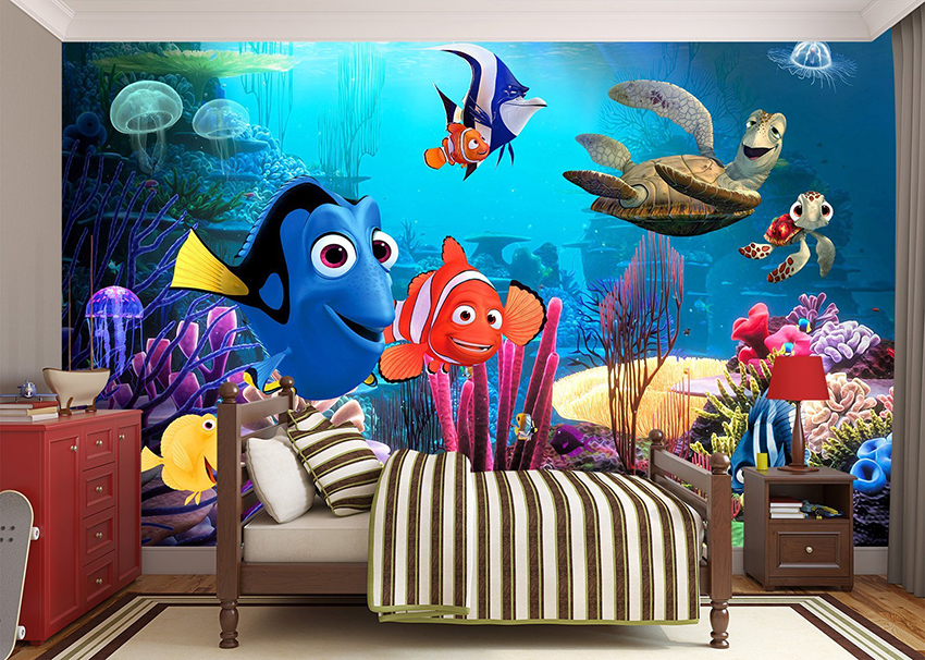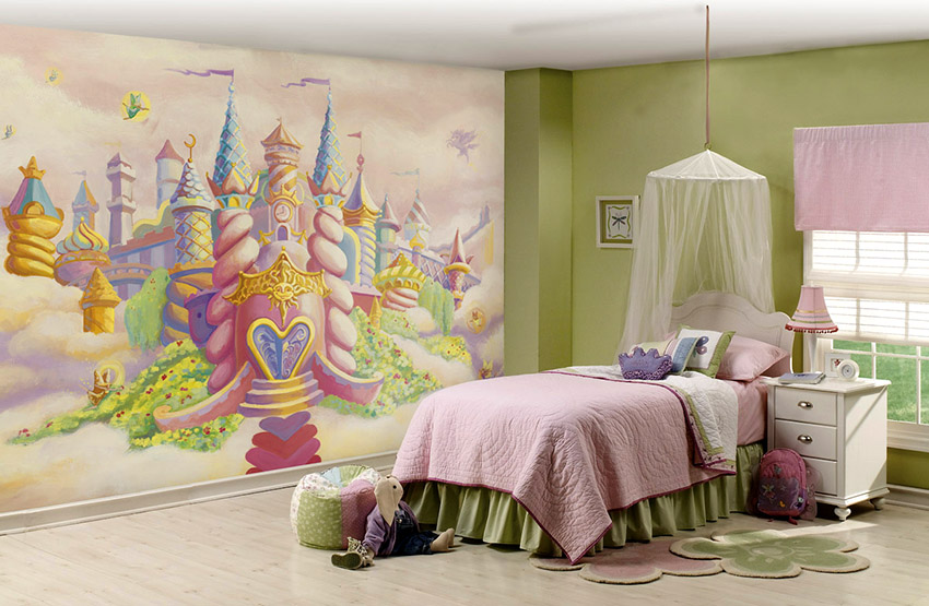 - Berumur 6-12 tahun. Pada usia ini, anak sudah dapat mengambil bahagian sepenuhnya dalam mewujudkan bahagian dalam bilik. Biasanya mereka memilih watak kartun atau buku komik kegemaran mereka. Gadis cenderung lebih suka gambar istana dan puteri, sementara kanak-kanak lelaki lebih suka memilih kereta, kereta api, kapal atau dinosaur. Landskap juga sesuai dalam kes ini.