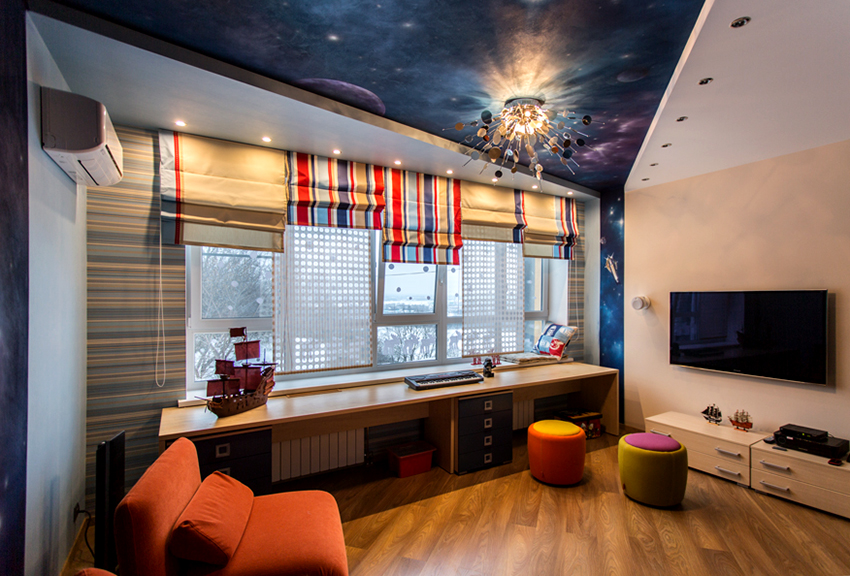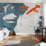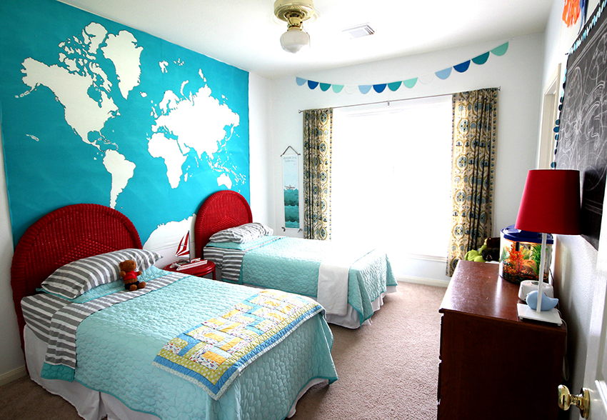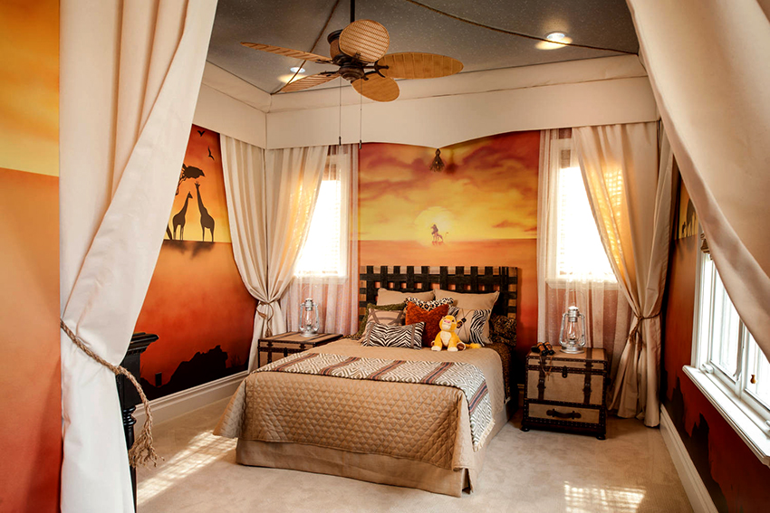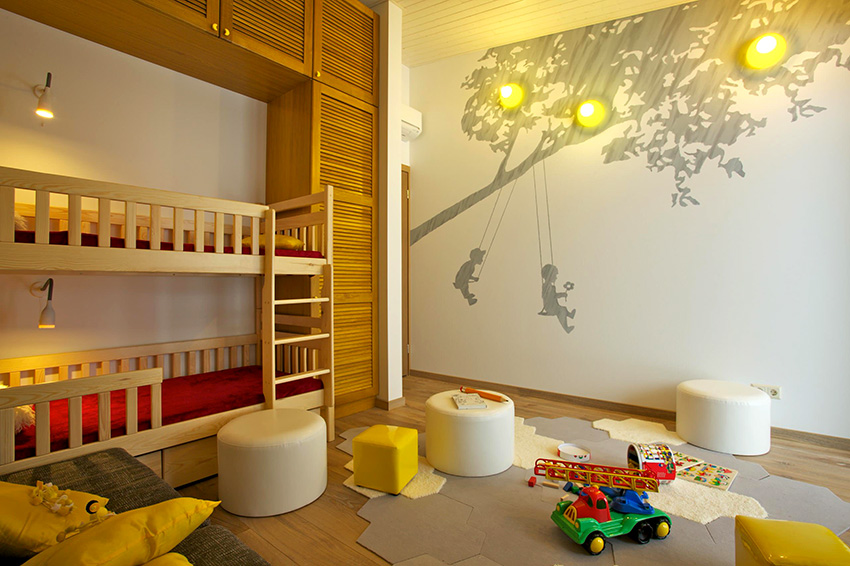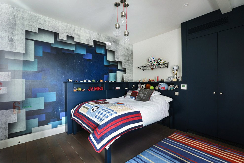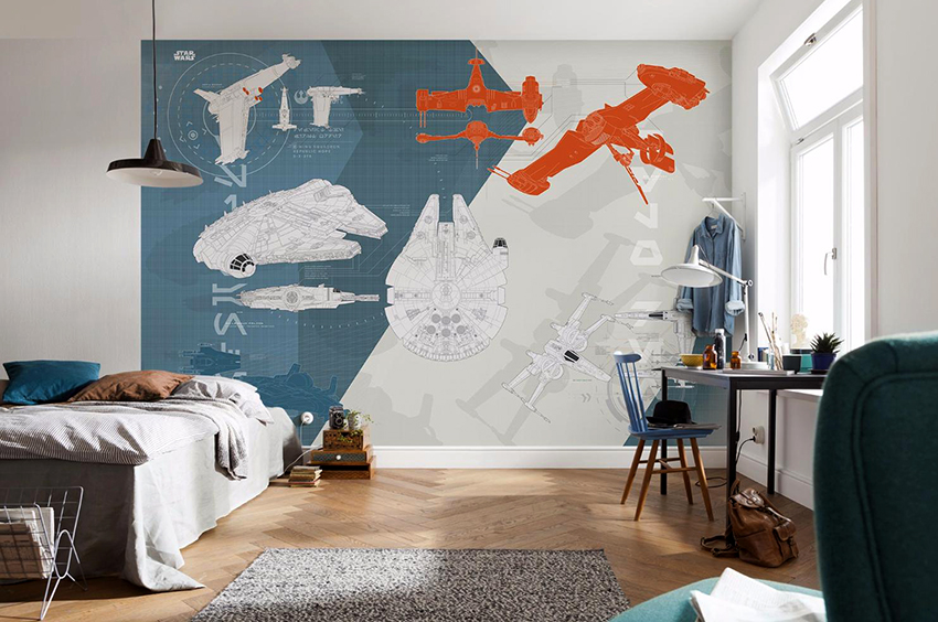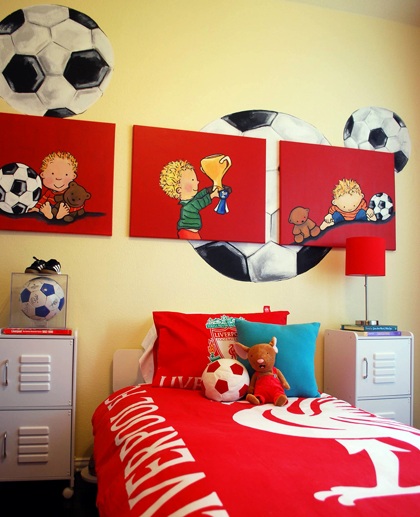 - Berumur 6-12 tahun. Pada usia ini, anak sudah dapat mengambil bahagian sepenuhnya dalam mewujudkan bahagian dalam bilik. Biasanya mereka memilih watak kartun atau buku komik kegemaran mereka. Gadis cenderung lebih suka gambar istana dan puteri, sementara kanak-kanak lelaki lebih suka memilih kereta, kereta api, kapal atau dinosaur. Landskap juga sesuai dalam kes ini.
